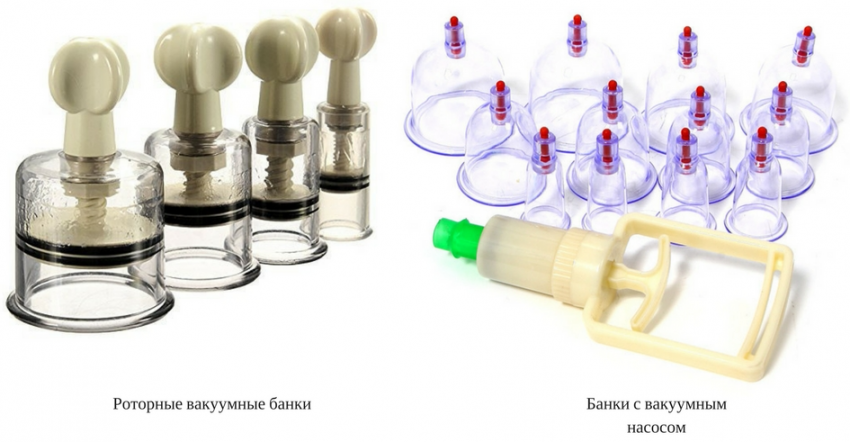 Пластиковые банки с насосом. Они изготавливаются из медицинской пластмассы, а вакуум внутри них создается с помощью специального насоса. При использовании этого вида банок имеется возможность регулировать интенсивность воздействия на кожу, однако, при этом велик риск травмирования тканей. Поэтому самостоятельно проводить массаж пластиковыми банками с насосом не рекомендуется.