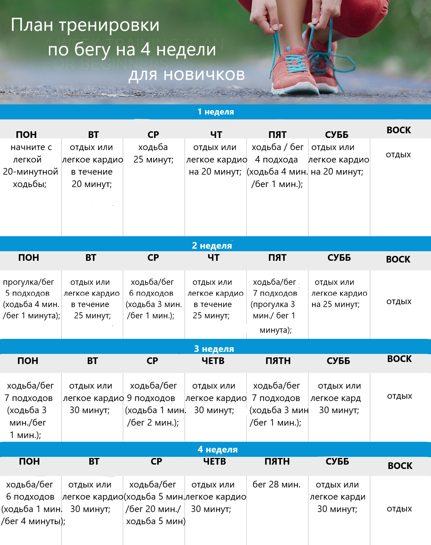 Примерный план беговых тренировок на 4 недели