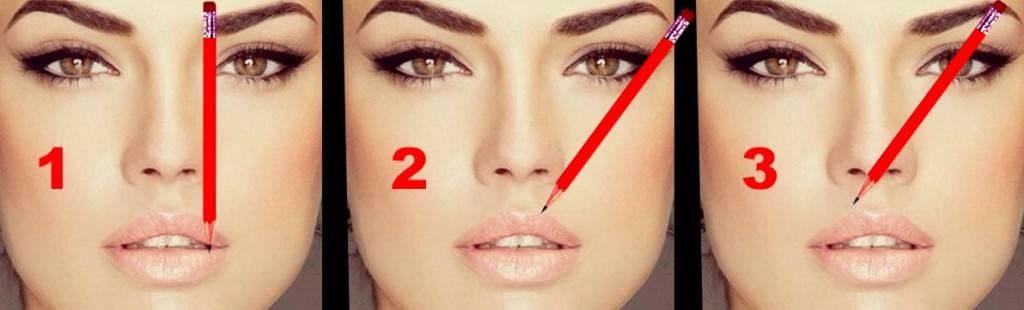 - Карандаш или ручку необходимо приложить параллельно к носу. Начало линии брови будет начинаться там, где карандаш коснётся её. Косметическим карандашом можно провести вертикальную линию вместе начала брови. Эту же манипуляцию следует проделать со второй половиной.