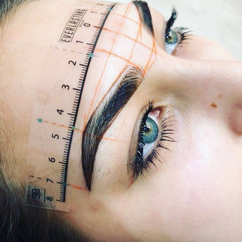Трафарет снимается. На коже остаётся четко прорисованный контур. Все, что выступает за контур, выщипывается любым способом. Остатки карандаша удаляются. Остается идеальный контур брови.