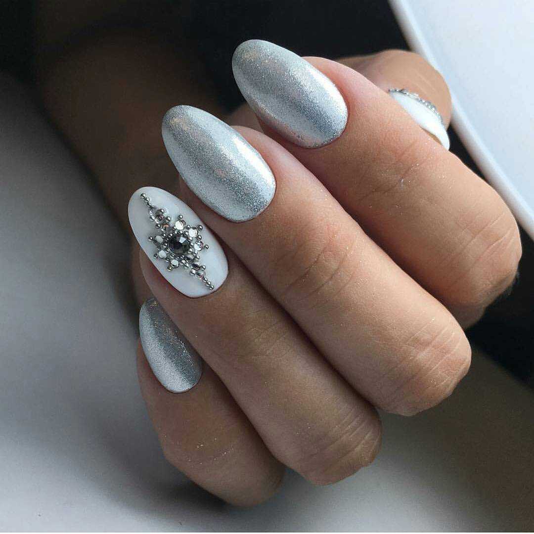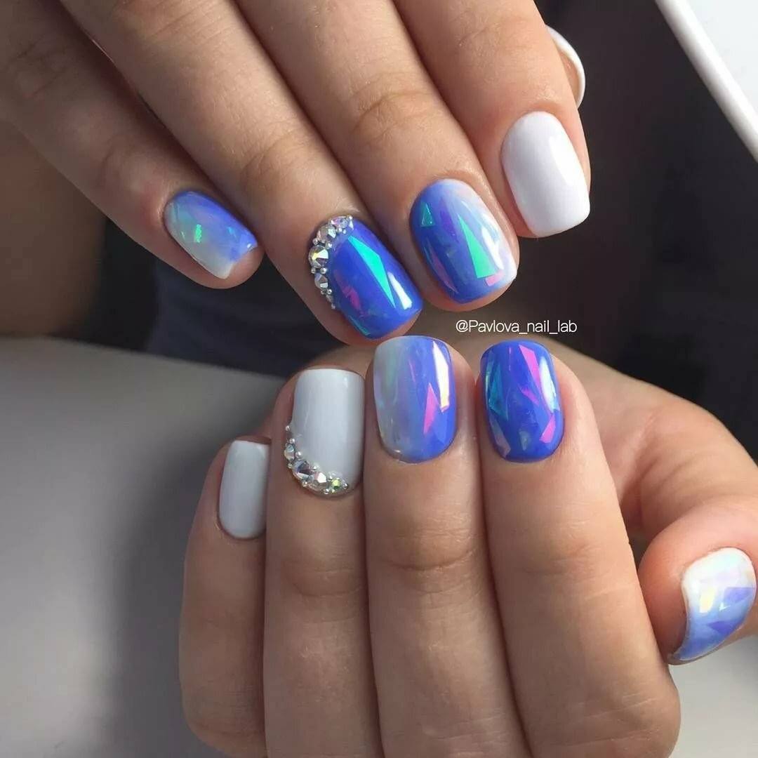 Белый цвет гармонирует с блеском металлик и золотом, поэтому его дополняют глиттером, фольгой. Особенно стильно смотрятся ногти, оформленные в стиле negative space, на которых белый лак сменяется эффектом «битого стекла», выполненного с помощью золотой фольги.