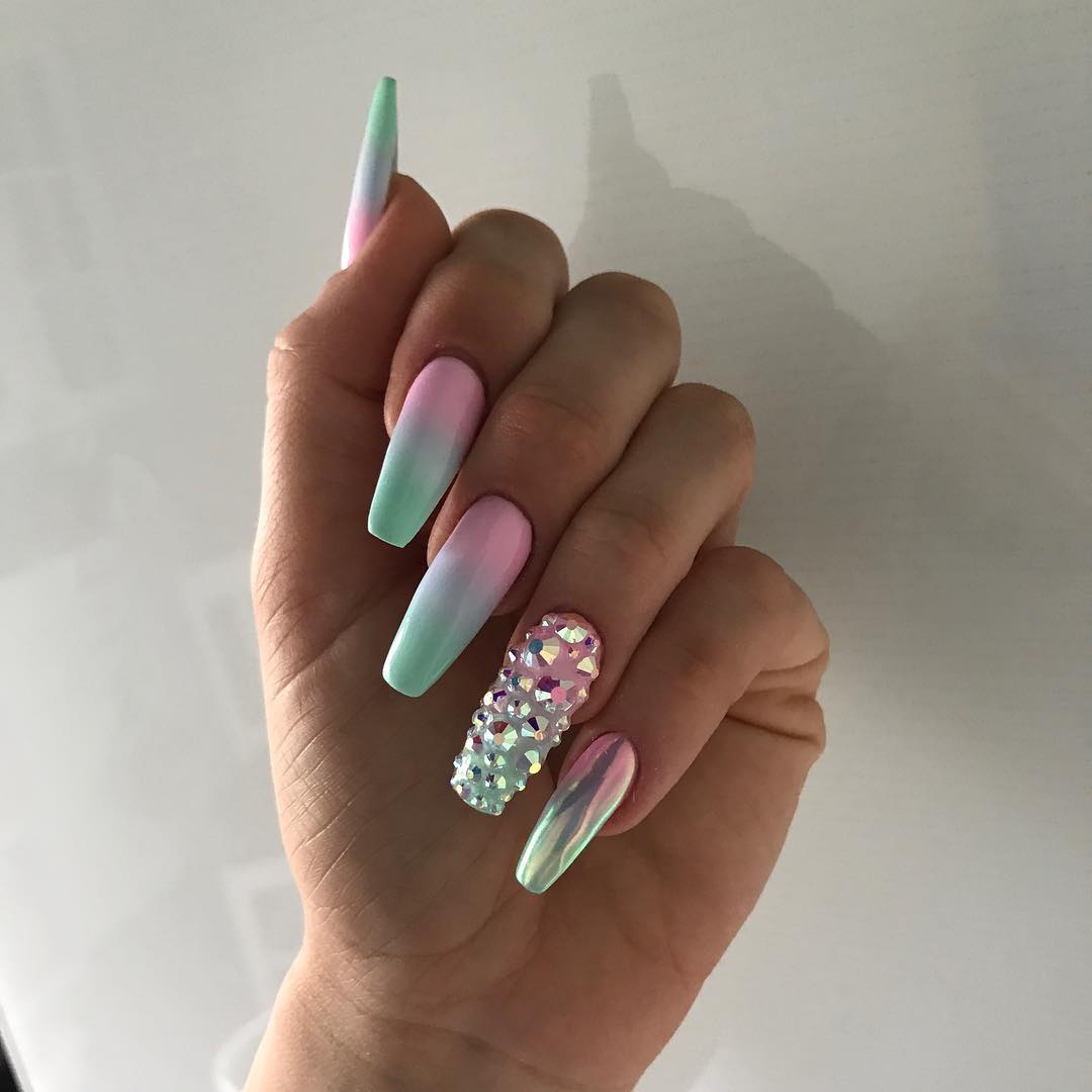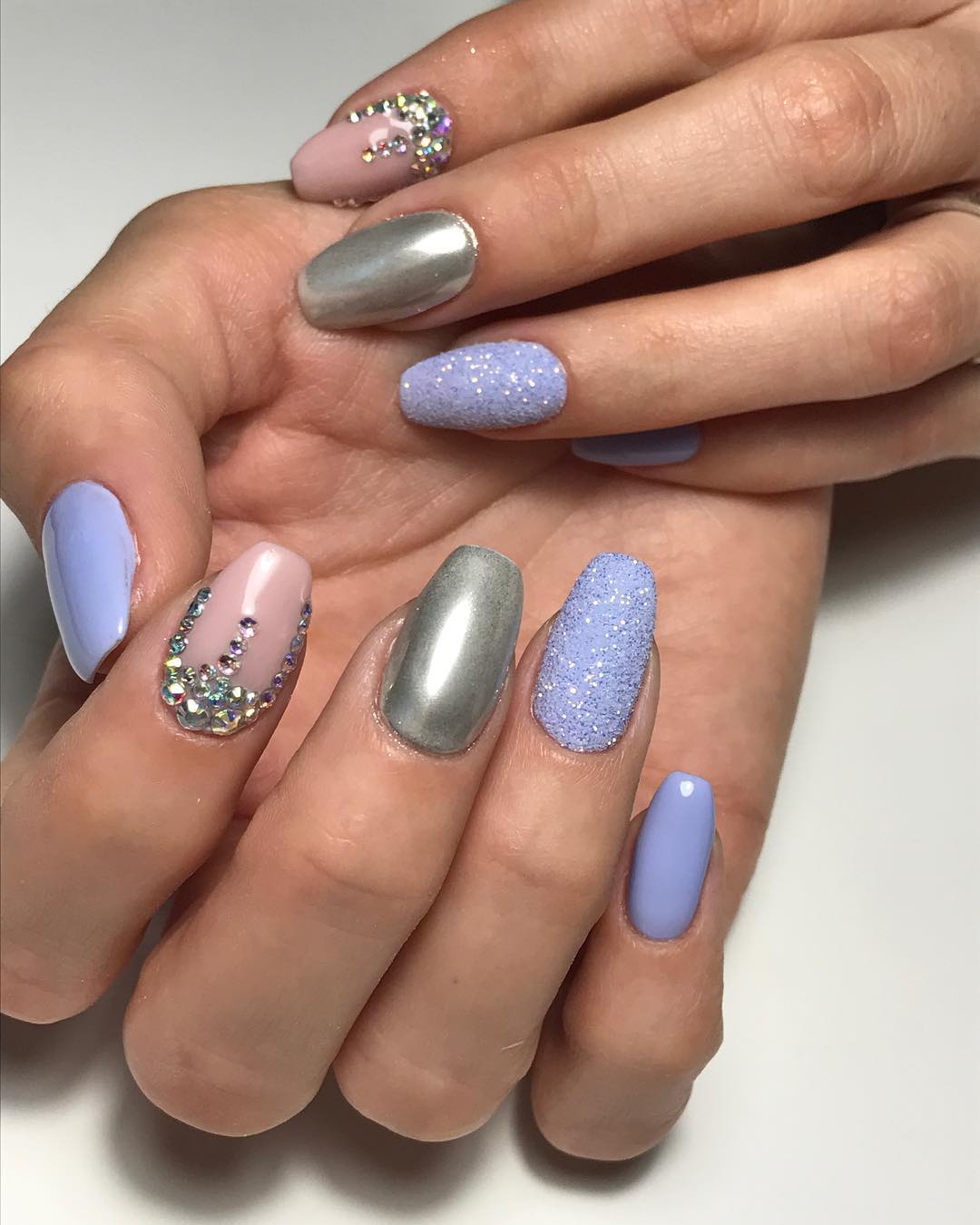 Нежные оттенки великолепно смотрятся в сочетании с серебряными, золотыми, разноцветными втирками. Создавайте не только мягкие пастельные нейл-арты, но и выбирайте в качестве основного фона розовый, нежно-голубой, сиреневый, мягкий желтый и другие яркие тона. Они также смотрятся на ногтях нежно и сдержанно, позволяют использовать стразы и камни необычной формы и расцветки.
