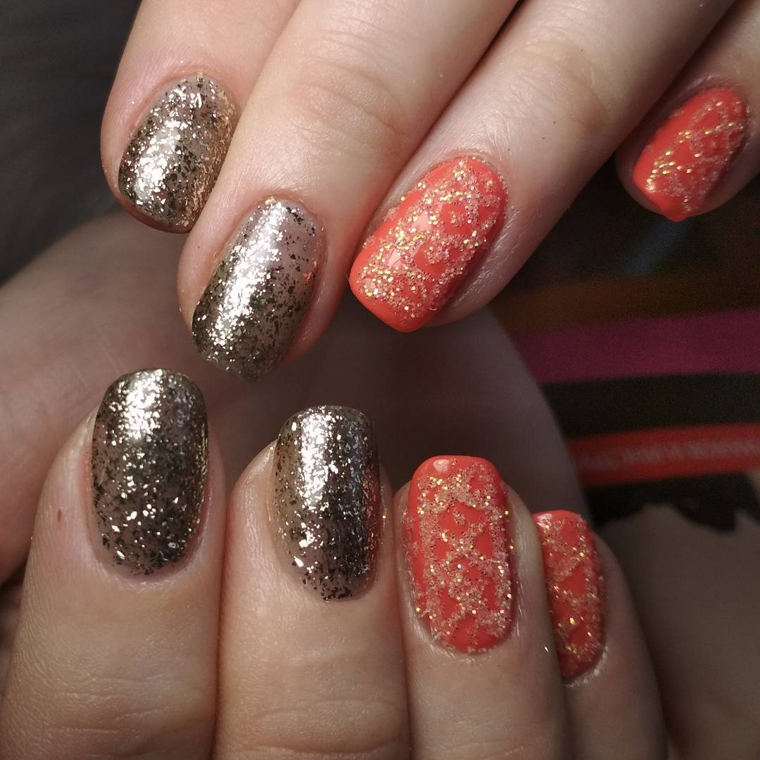 С блестками. Для градиента подойдет глиттер разного цвета и величины. По направлению к кончику ногтя глиттер должен быть практически незаметным. Тогда он будет слегка поблескивать отдельными частицами, а не сиять интенсивно.