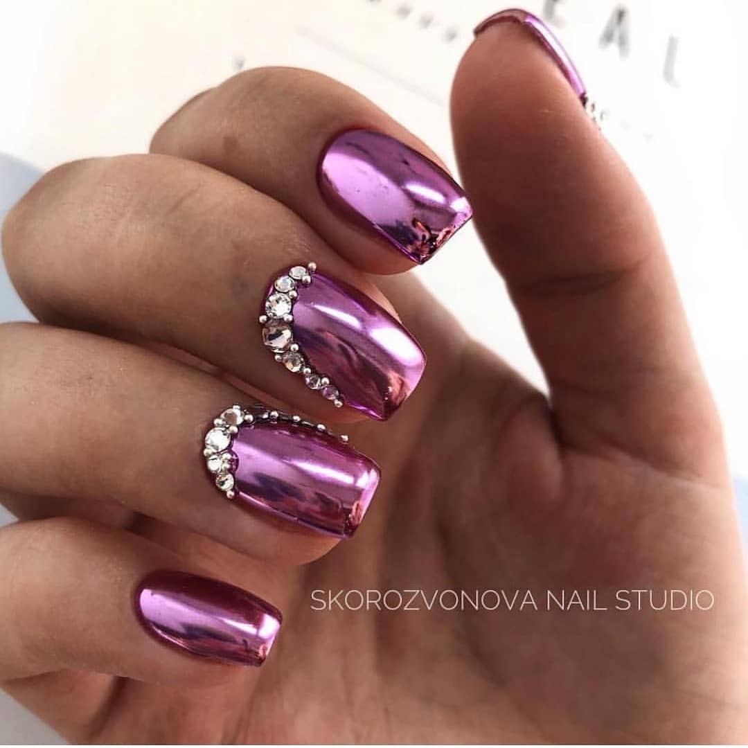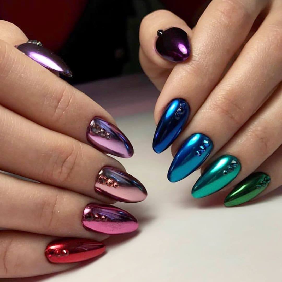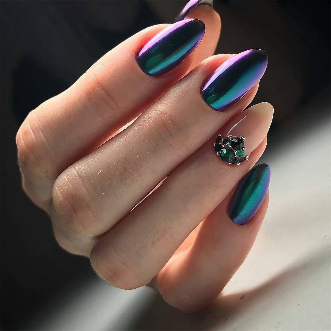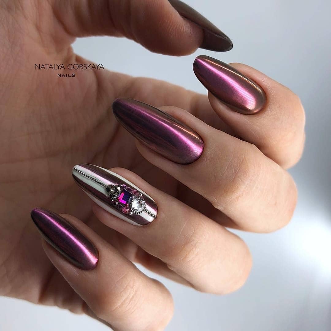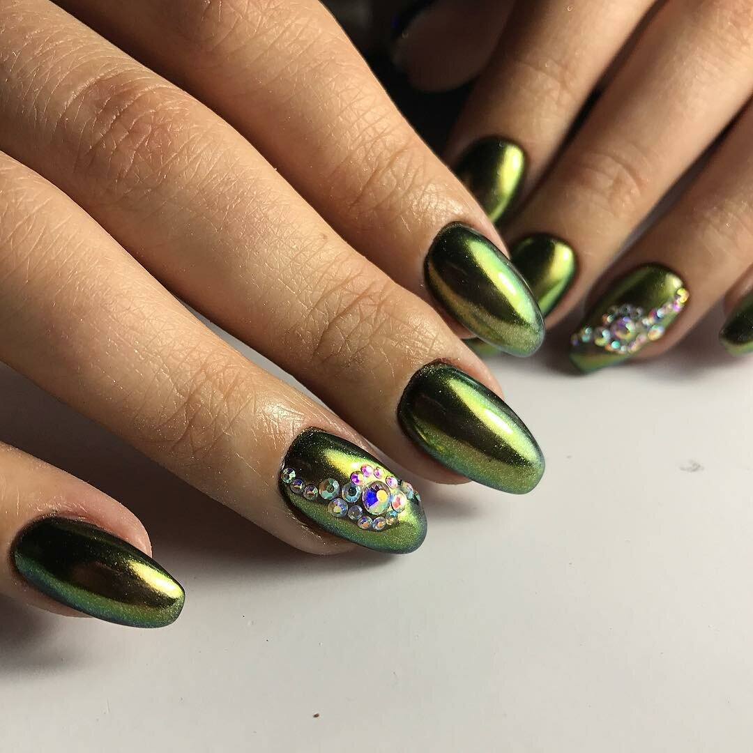 Этот вариант подойдет для девушек, желающих получить хищные ноготки, переливающие металлом. А для создания хромового покрытия может быть использована втирка различного оттенка.