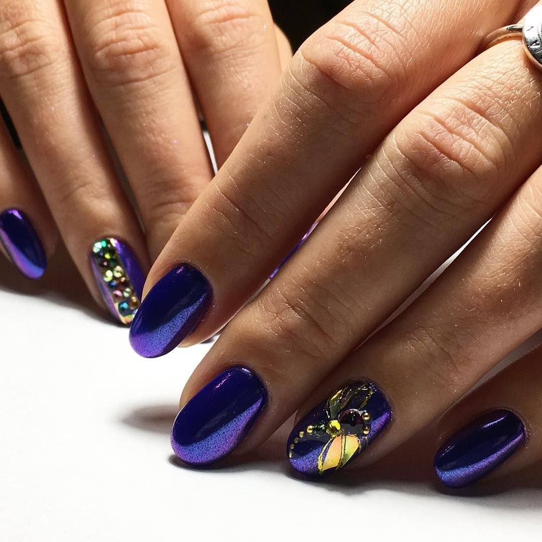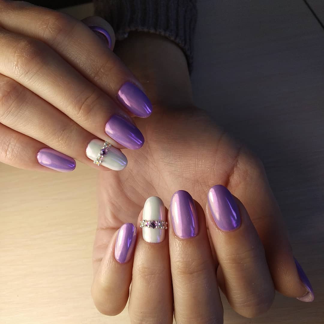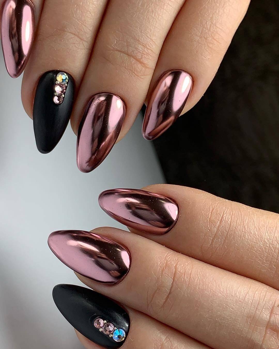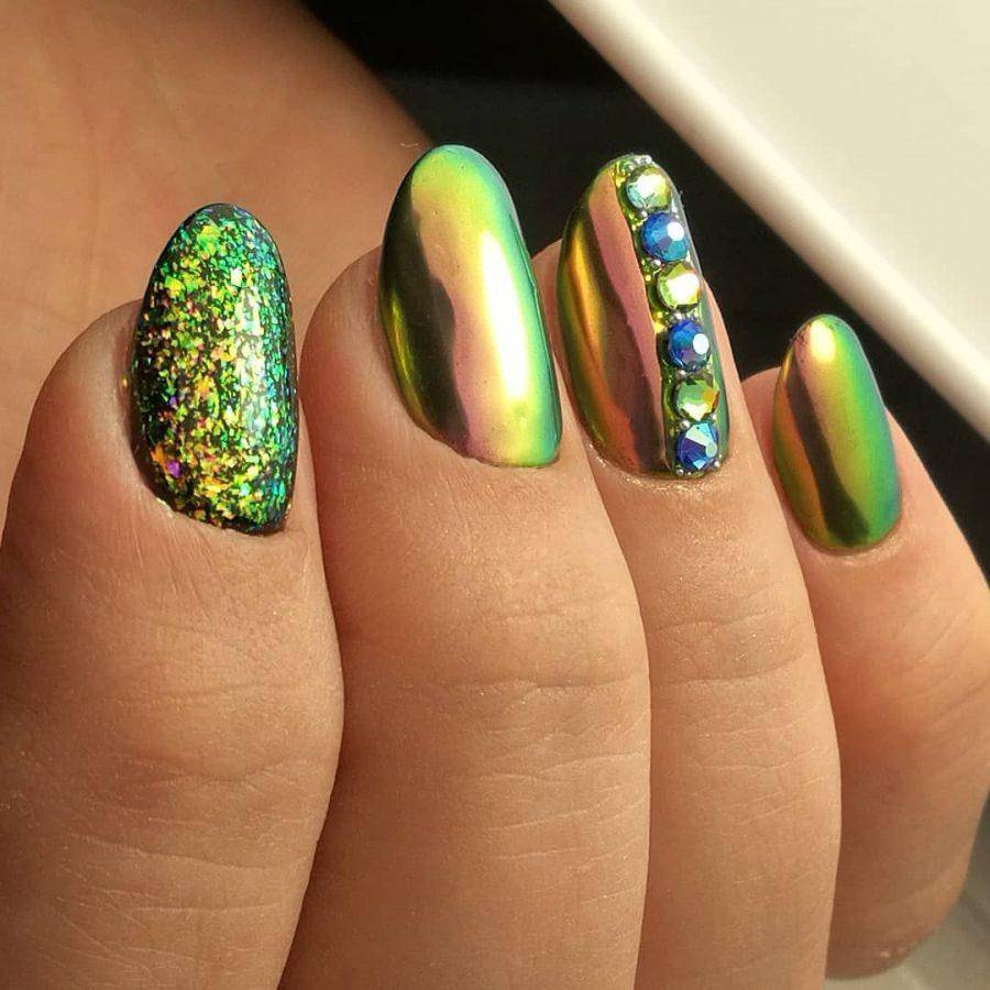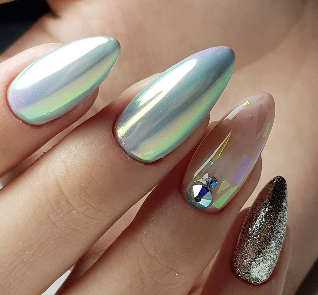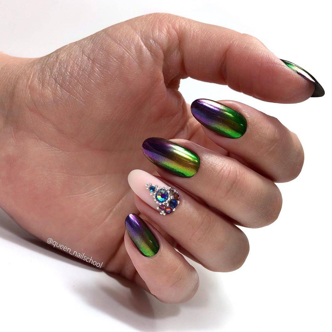 Этот вариант подойдет для девушек, желающих получить хищные ноготки, переливающие металлом. А для создания хромового покрытия может быть использована втирка различного оттенка.