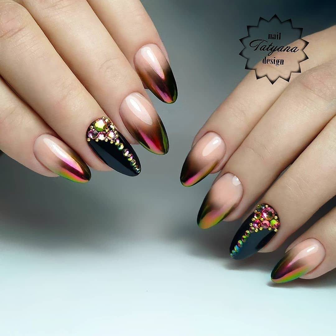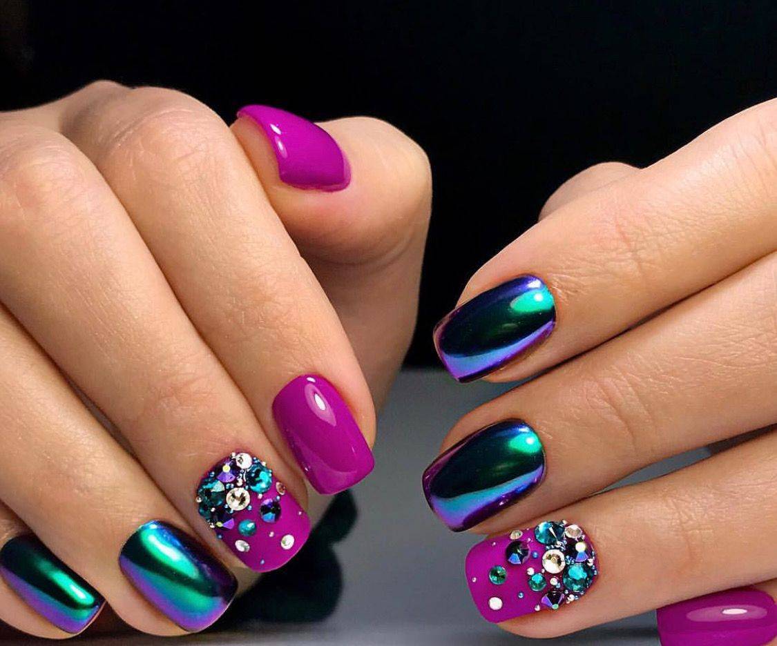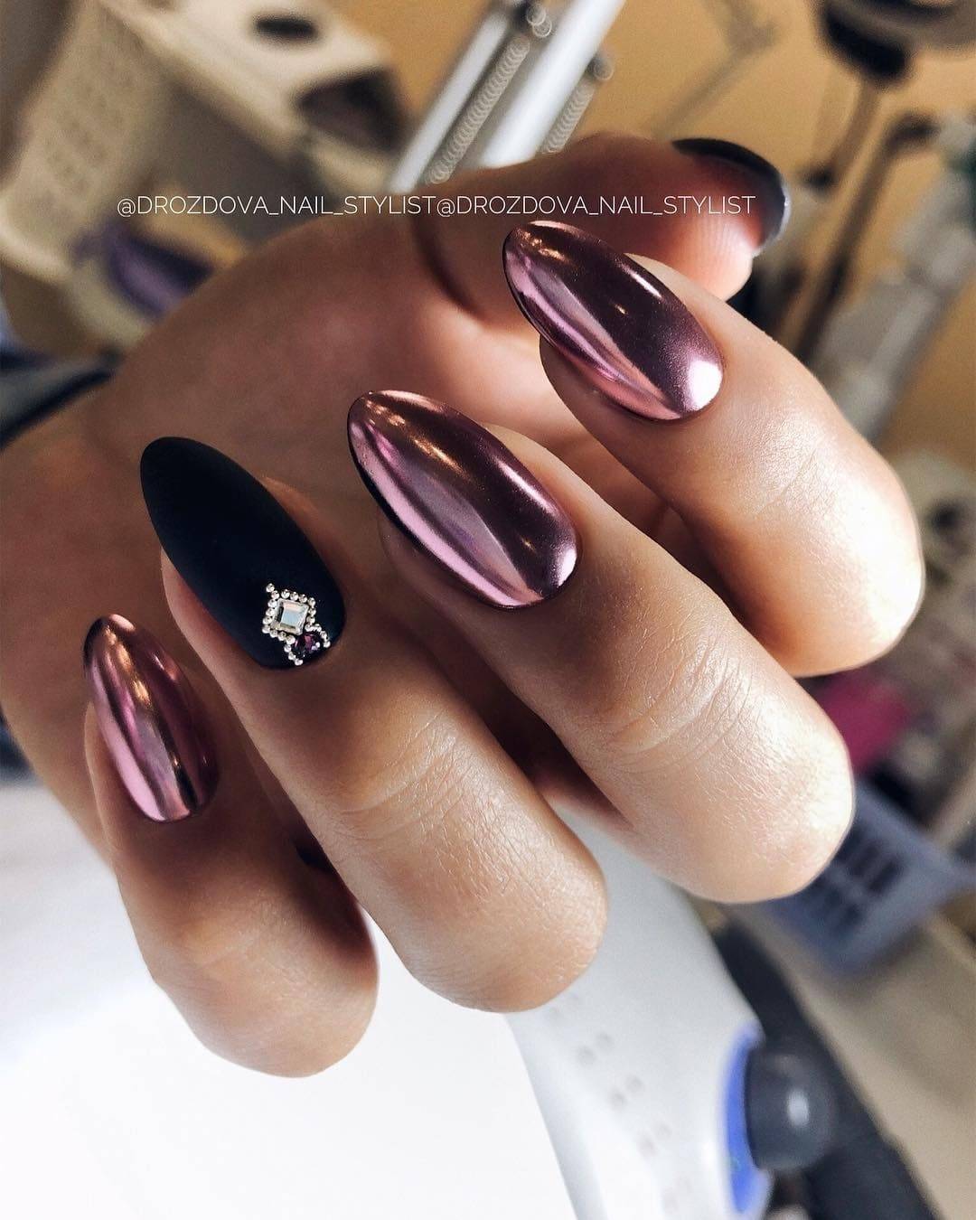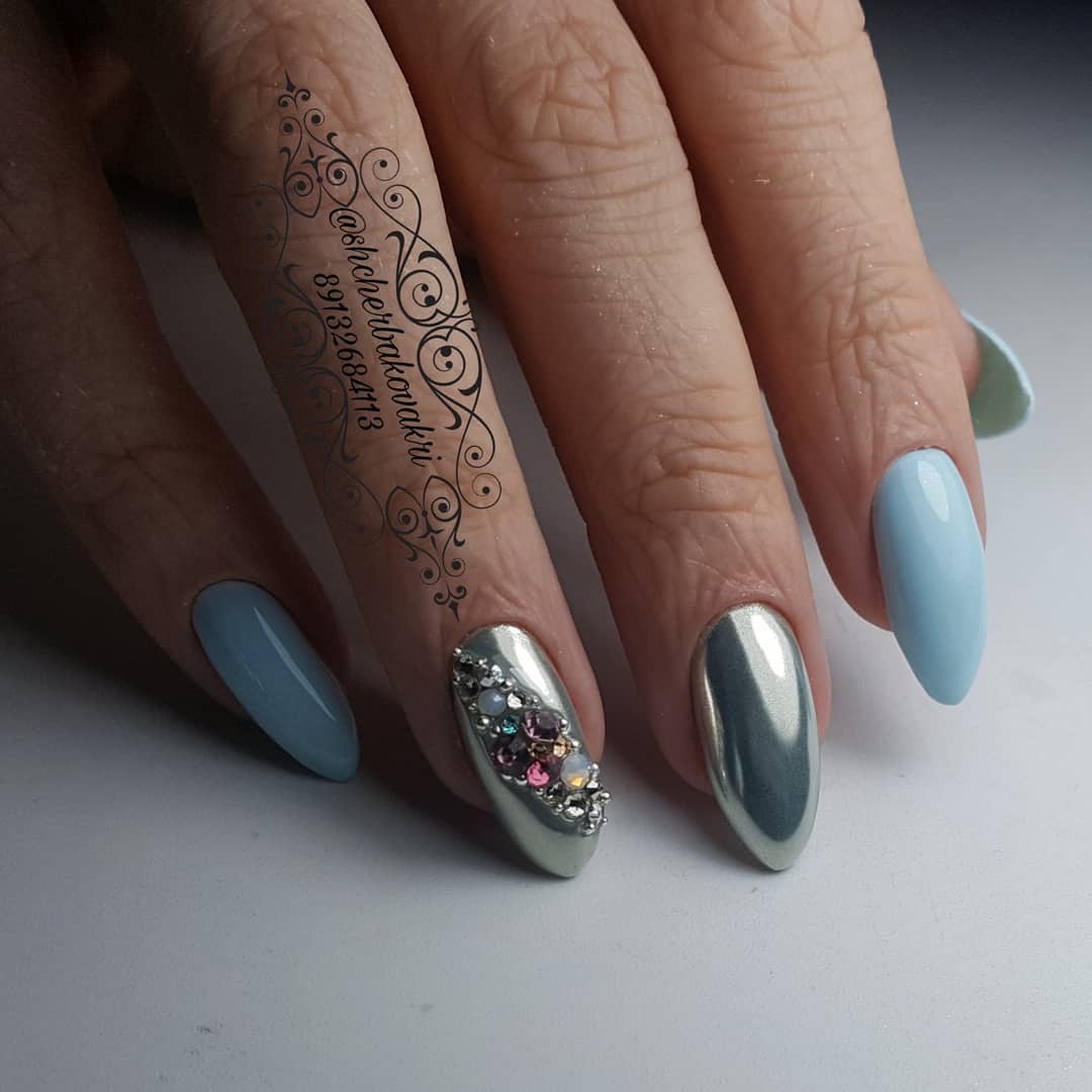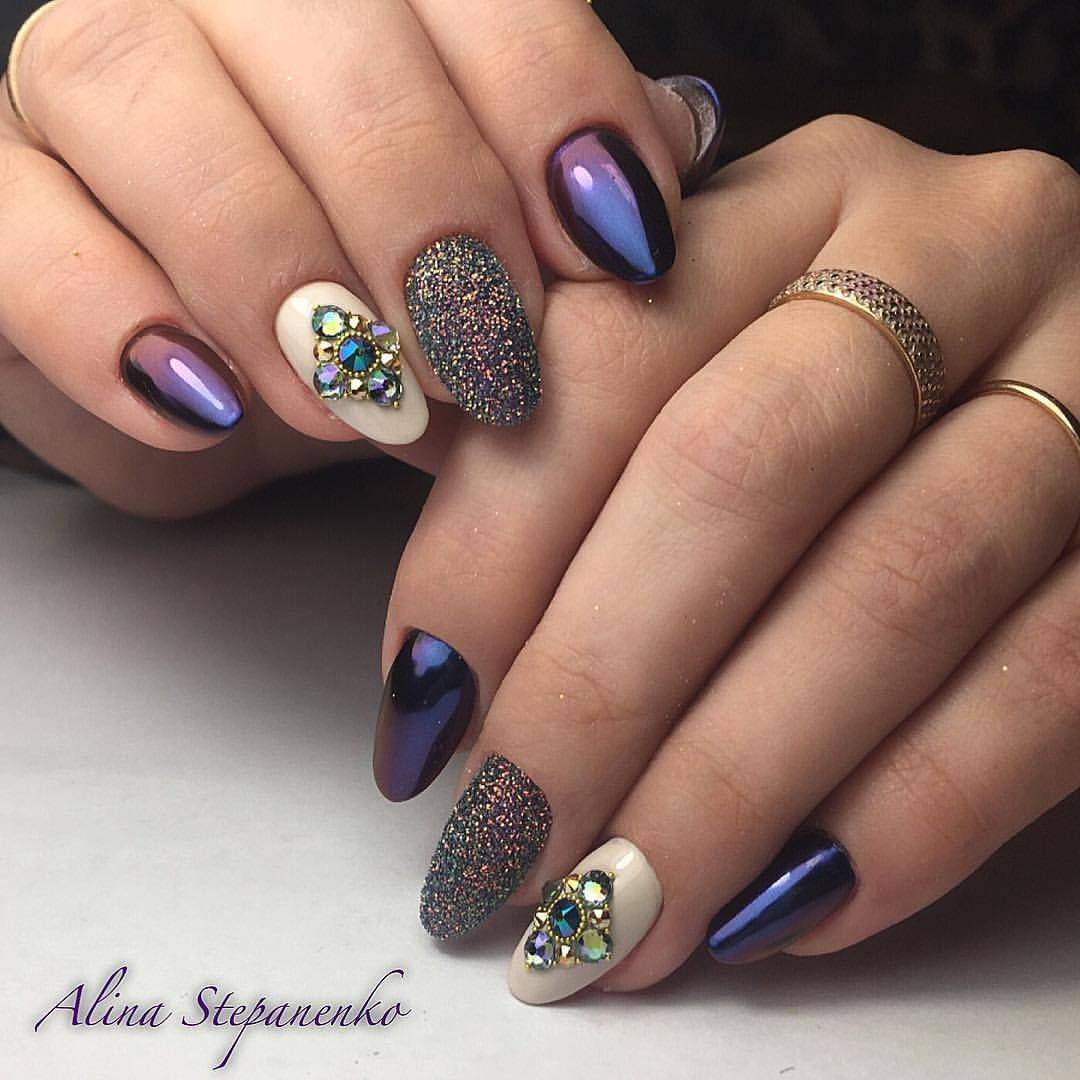 Этот вариант подойдет для девушек, желающих получить хищные ноготки, переливающие металлом. А для создания хромового покрытия может быть использована втирка различного оттенка.