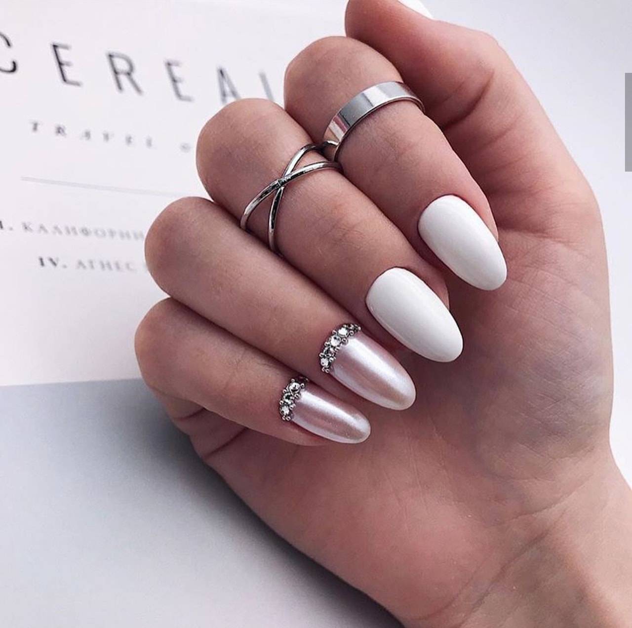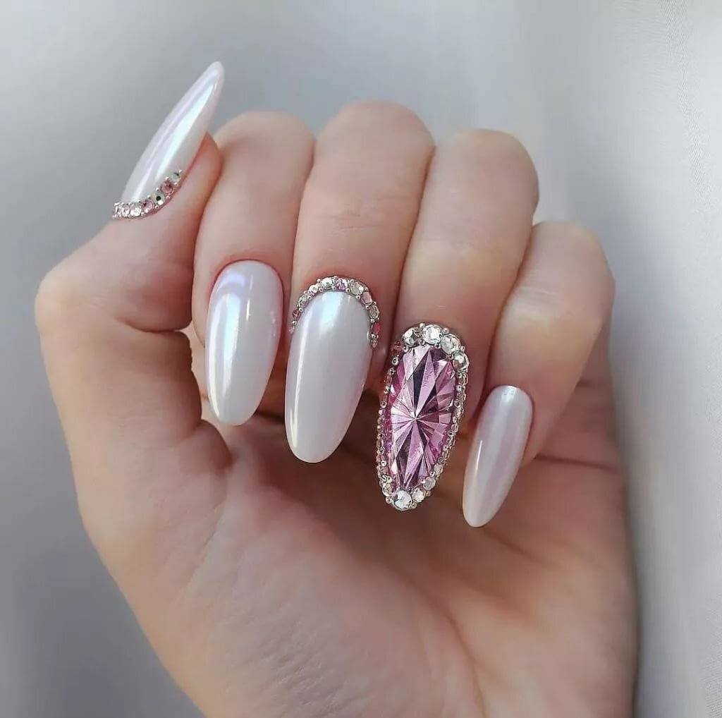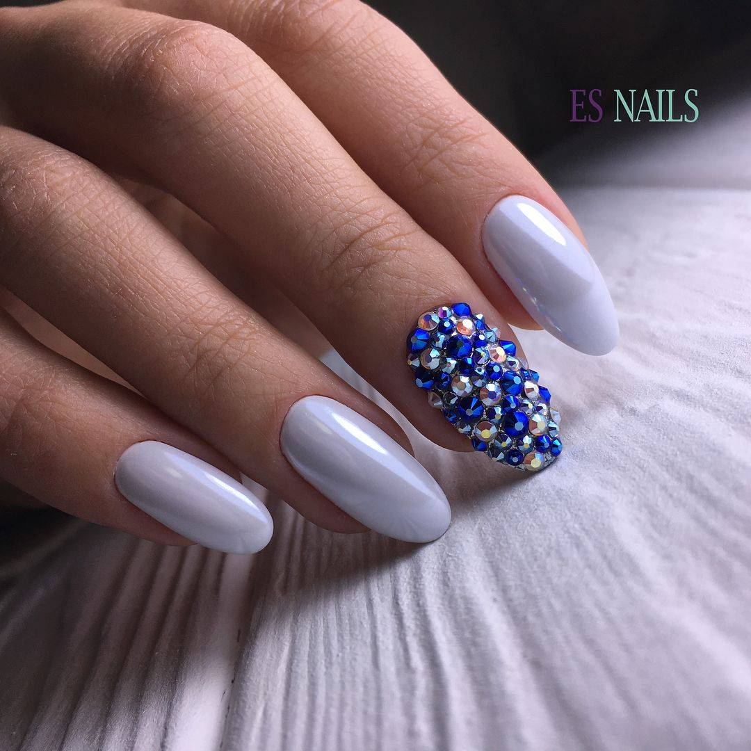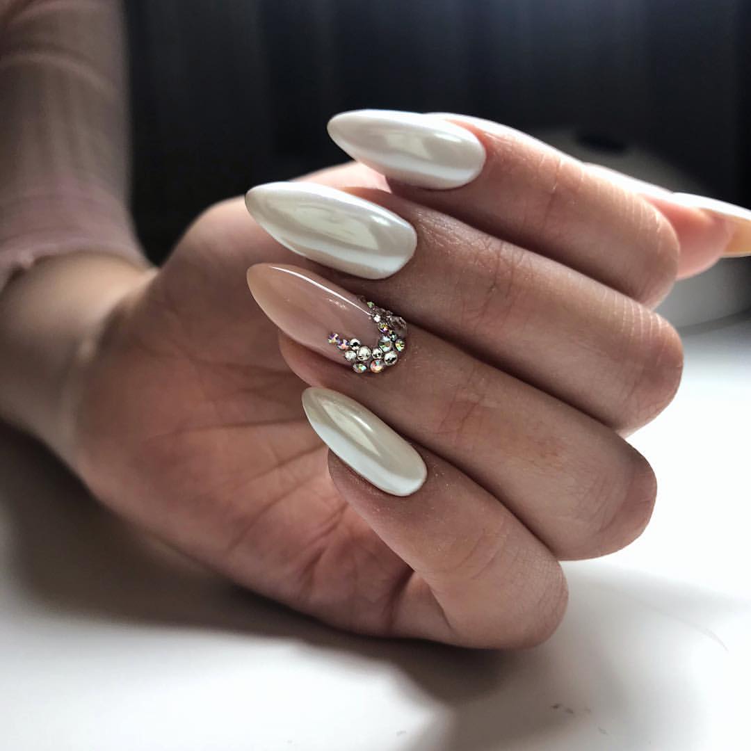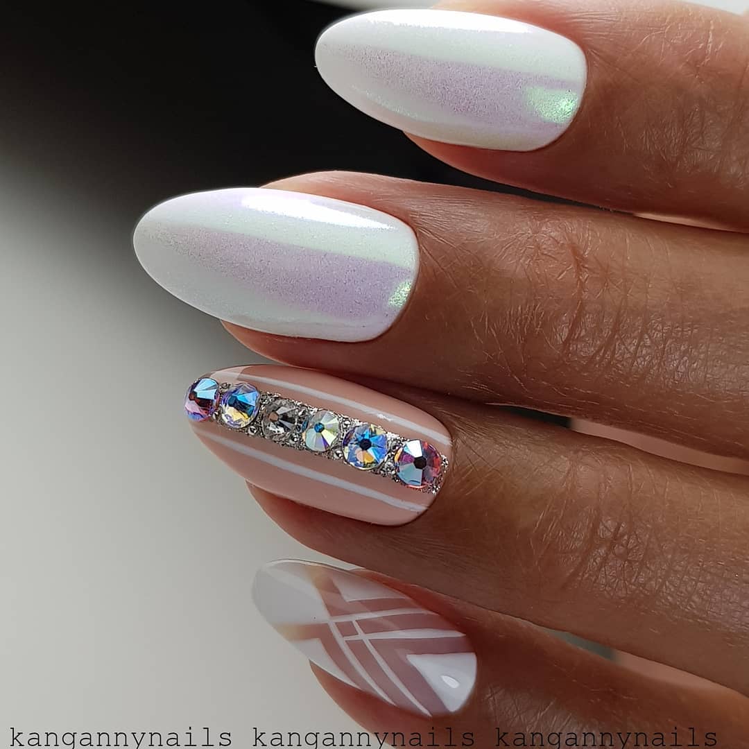 Белый фон чаще всего дополняют жемчужной втиркой. Дизайн получится удивительно нежным и стильным. Стразы лучше расположить в прикорневой зоне ногтя, выполнить простую геометрию.
