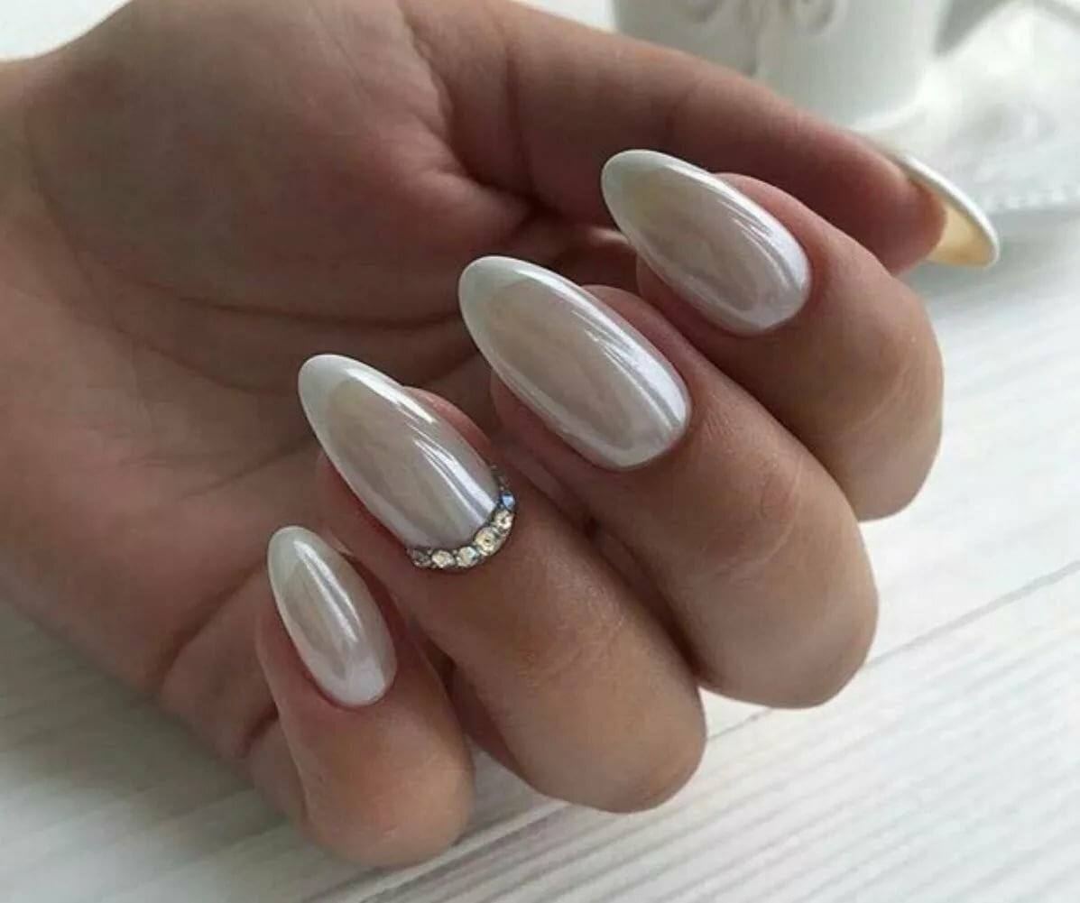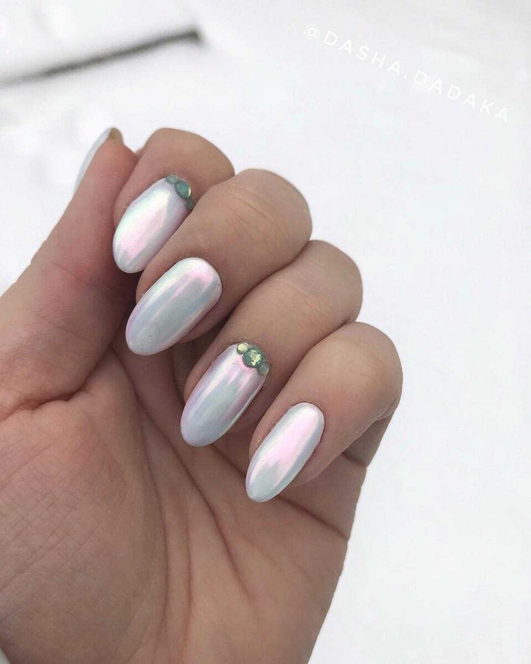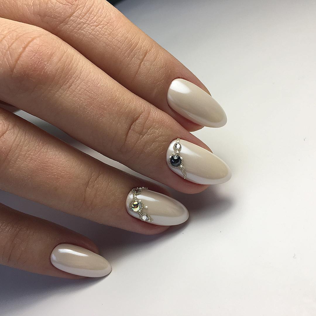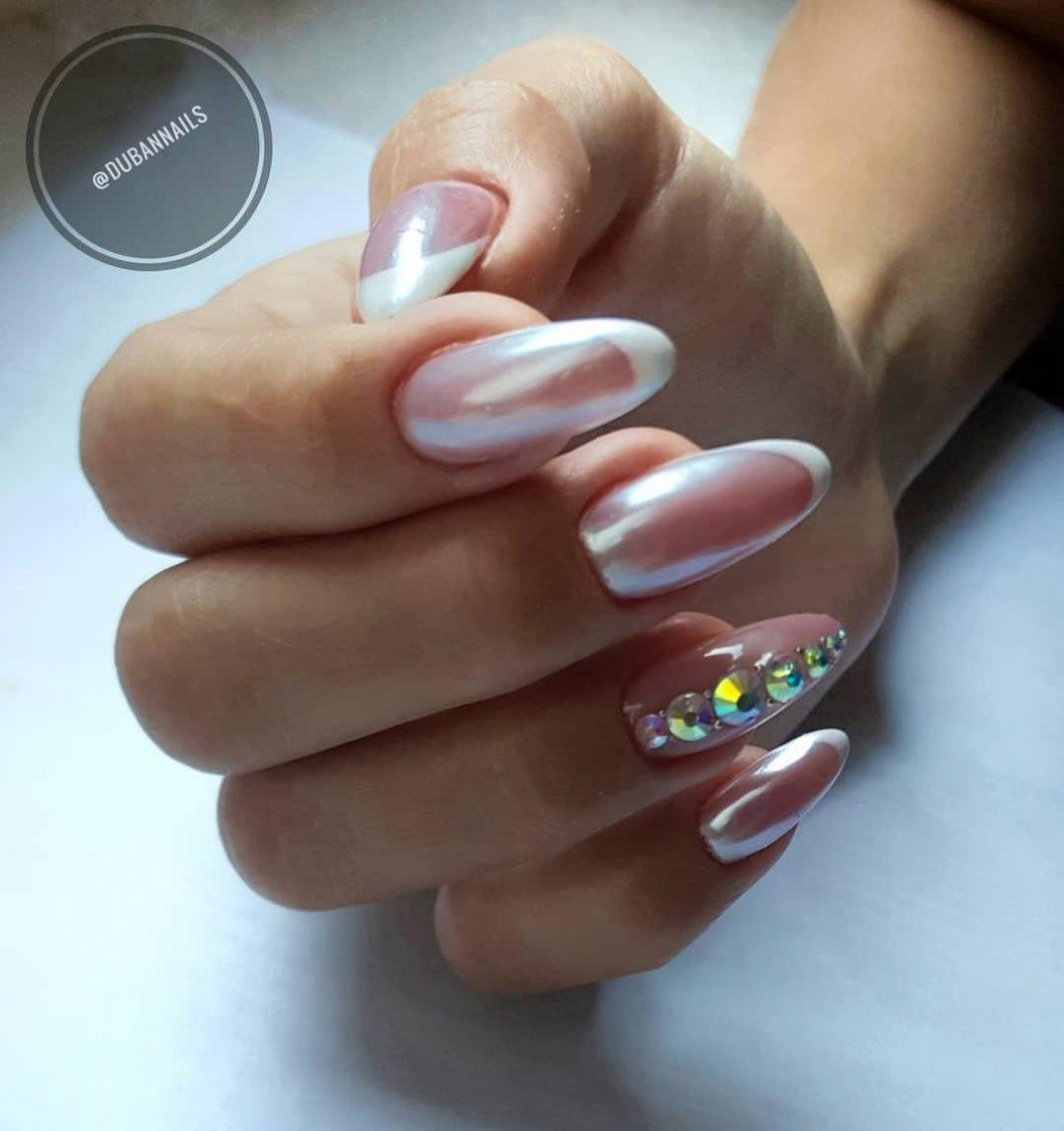 Белый фон чаще всего дополняют жемчужной втиркой. Дизайн получится удивительно нежным и стильным. Стразы лучше расположить в прикорневой зоне ногтя, выполнить простую геометрию.