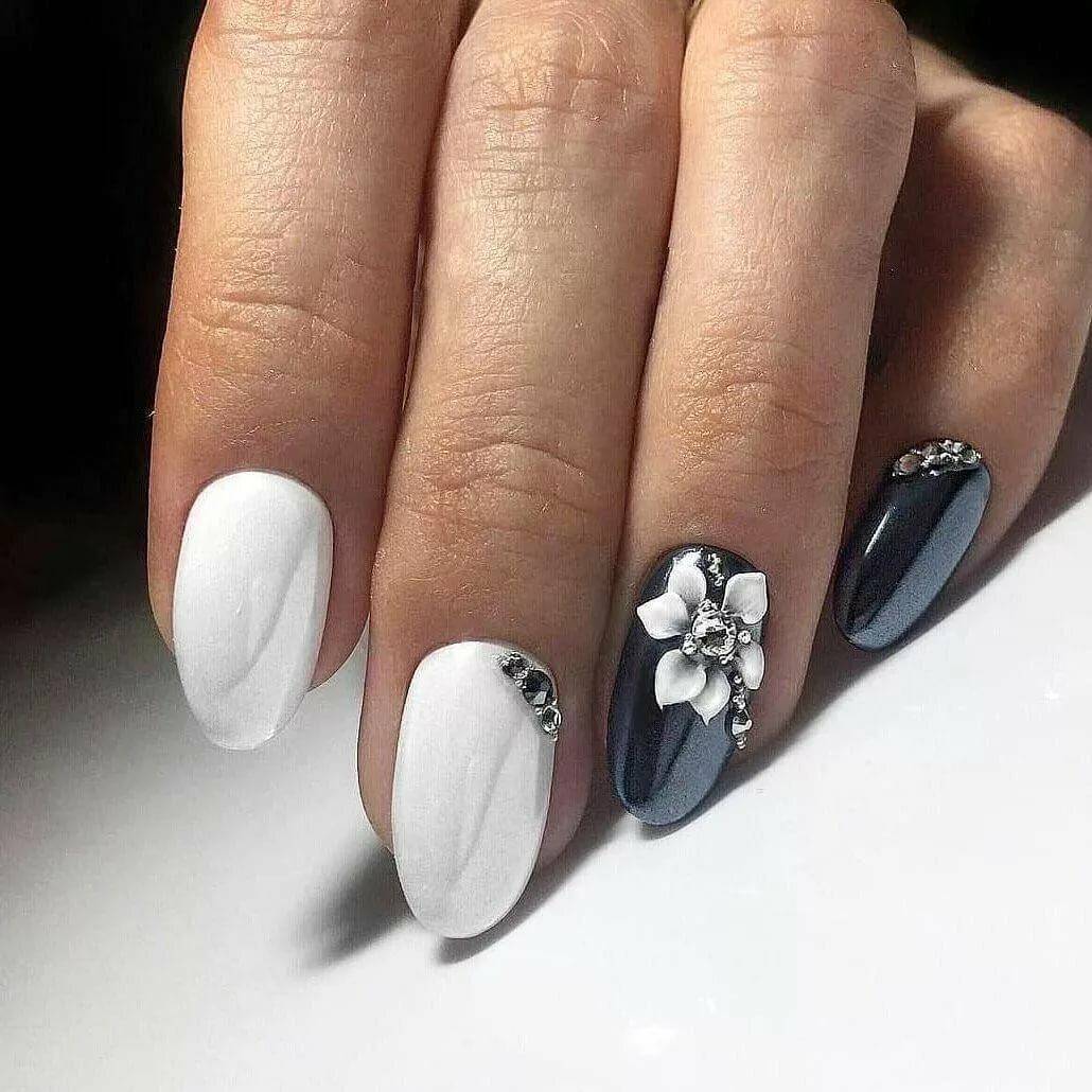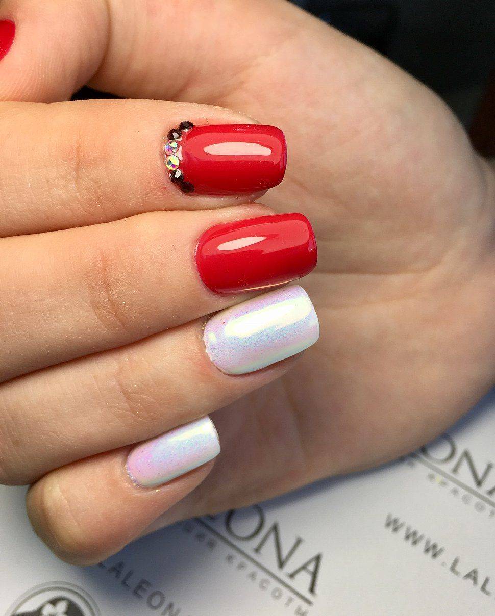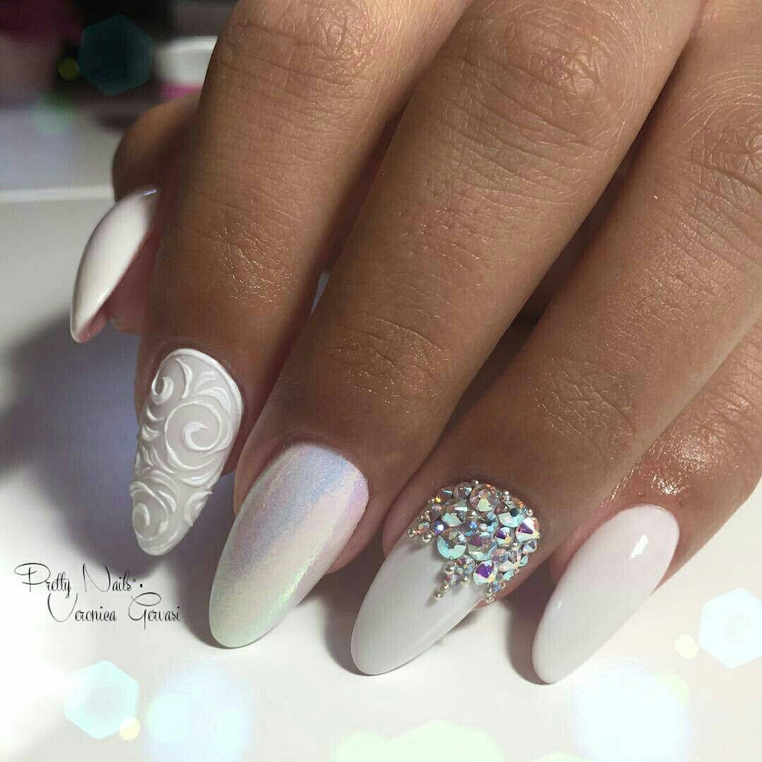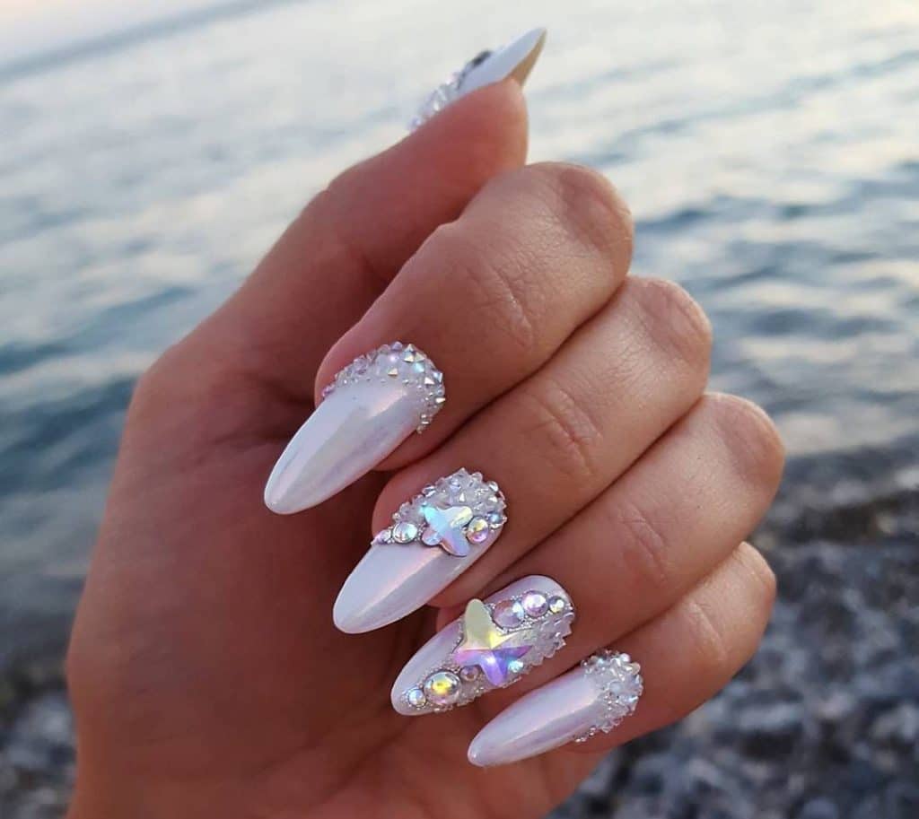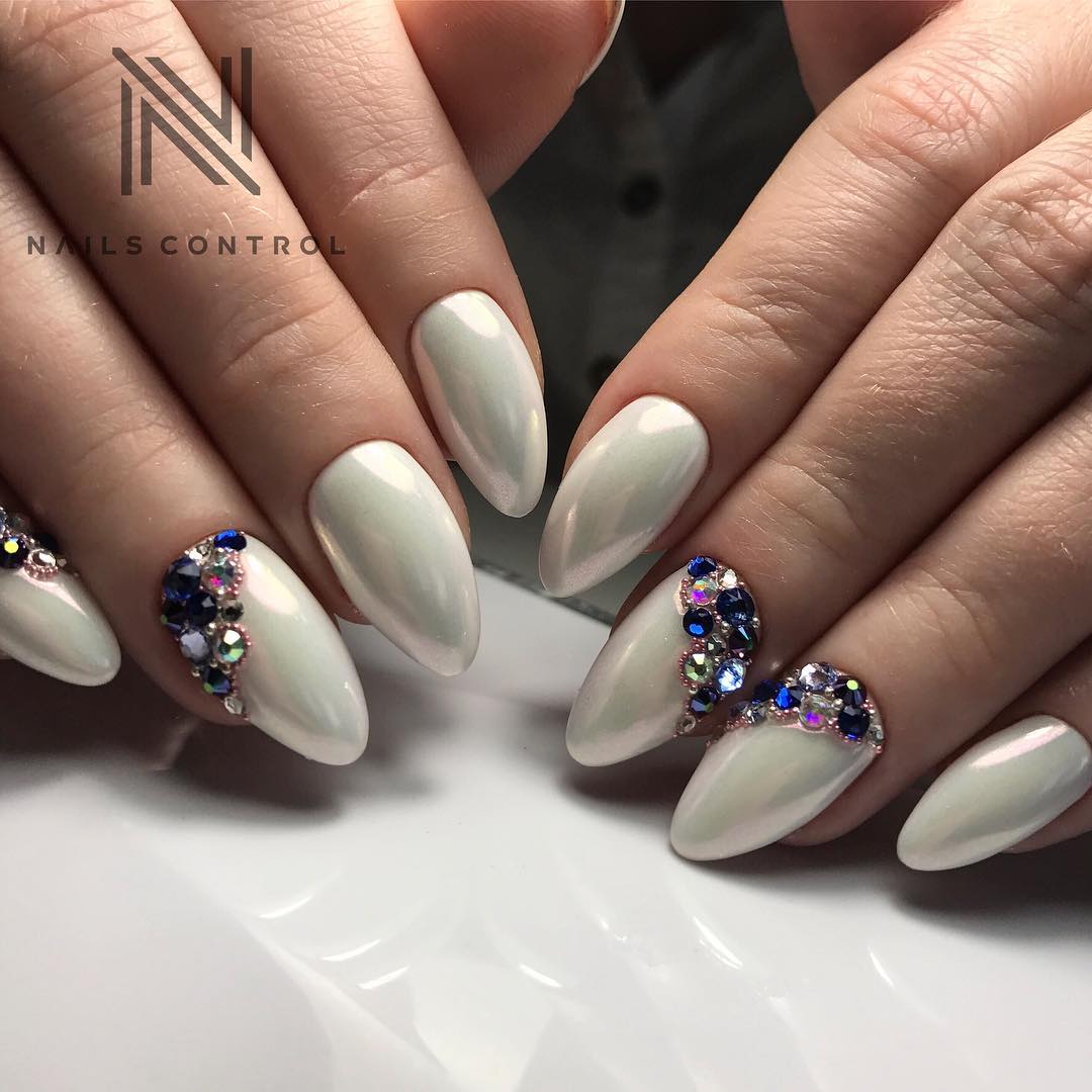 Белый фон чаще всего дополняют жемчужной втиркой. Дизайн получится удивительно нежным и стильным. Стразы лучше расположить в прикорневой зоне ногтя, выполнить простую геометрию.