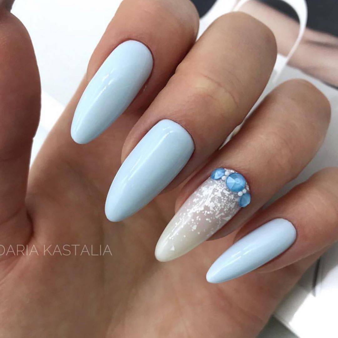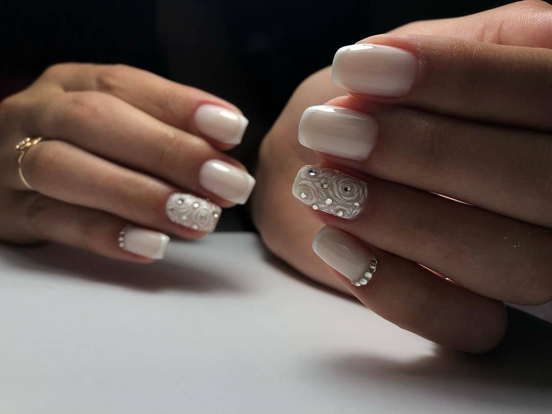Белый маникюр с втиркой и стразами актуален как для летнего сезона, так и для зимнего. В тренде однотонное покрытие ногтей втиркой, французский и лунный маникюр, дизайн с голубым цветом и кружевным декором. Белый маникюр с втиркой может быть дополнен сложным декором, например, лепниной, крупными стразами, конусами, шармами.