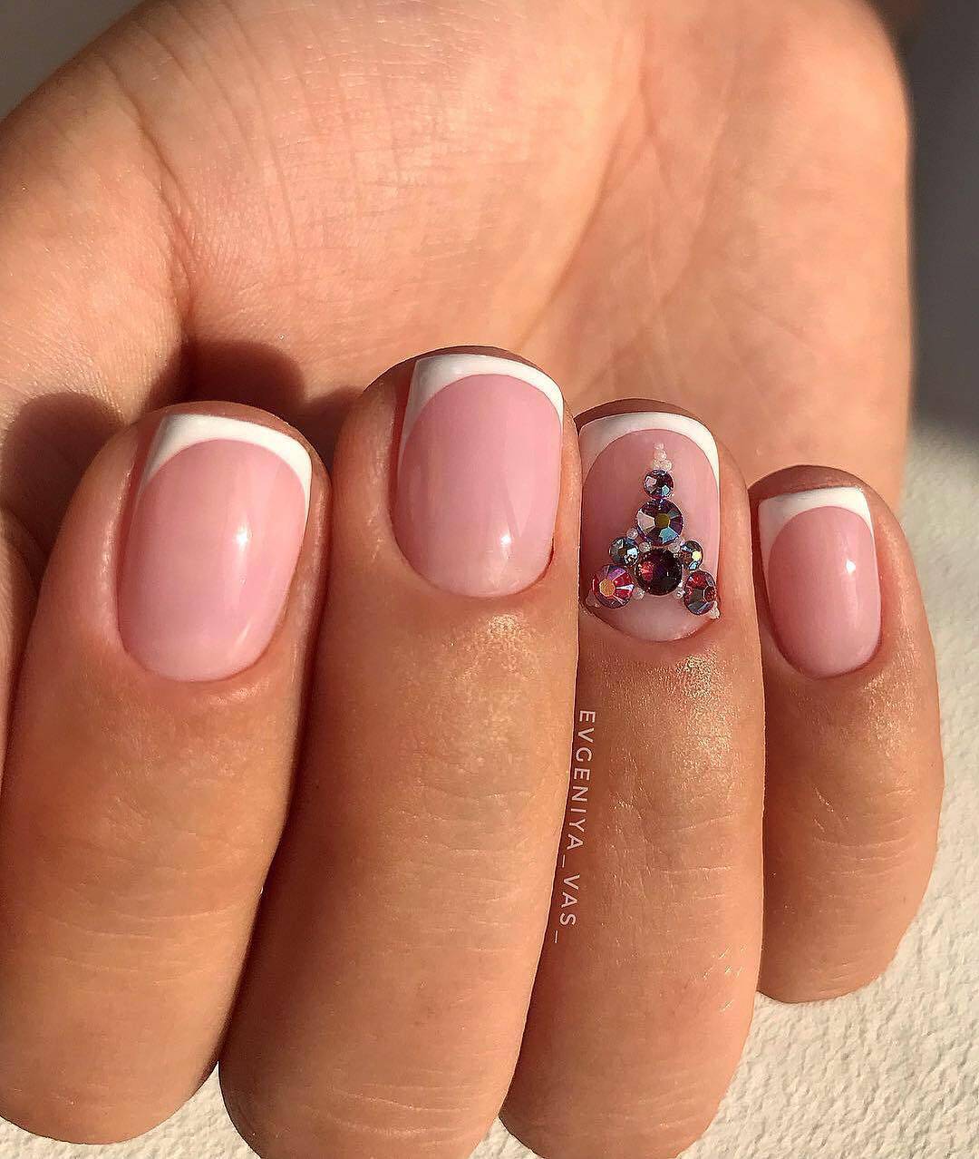 Френч со стразами может оформляться в любой комбинации оттенков, но особое внимание, всё-таки, стоит уделить классическому варианту. Нюдовое, прозрачное, бледно-розовое или нежно-персиковое основание с белоснежным кончиком смотрится само по себе очень женственно и элегантно, а блестящие детали в виде оригинальных узоров сделают оформление ещё изысканней