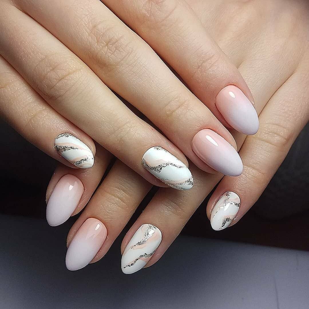 Мраморный маникюр смотрится очень нежно и сдержанно. Натуральные текстуры на ногтях облагораживают ноготки, делают пальчики тоньше и изящнее. Мраморный маникюр наиболее уместно смотрится на длинных миндальных ногтях.
