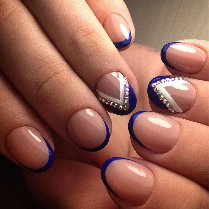 Синий френч – это еще один оригинальный подход к исполнению классического маникюра. Чтобы придать дизайну нежности, попросите мастера сделать небольшой дополнительный рисунок. А если хочется больше ярких переливов, тогда вам не обойтись без маленьких страз, которые ловят каждый лучик света и отражают его своим неимоверным блеском.