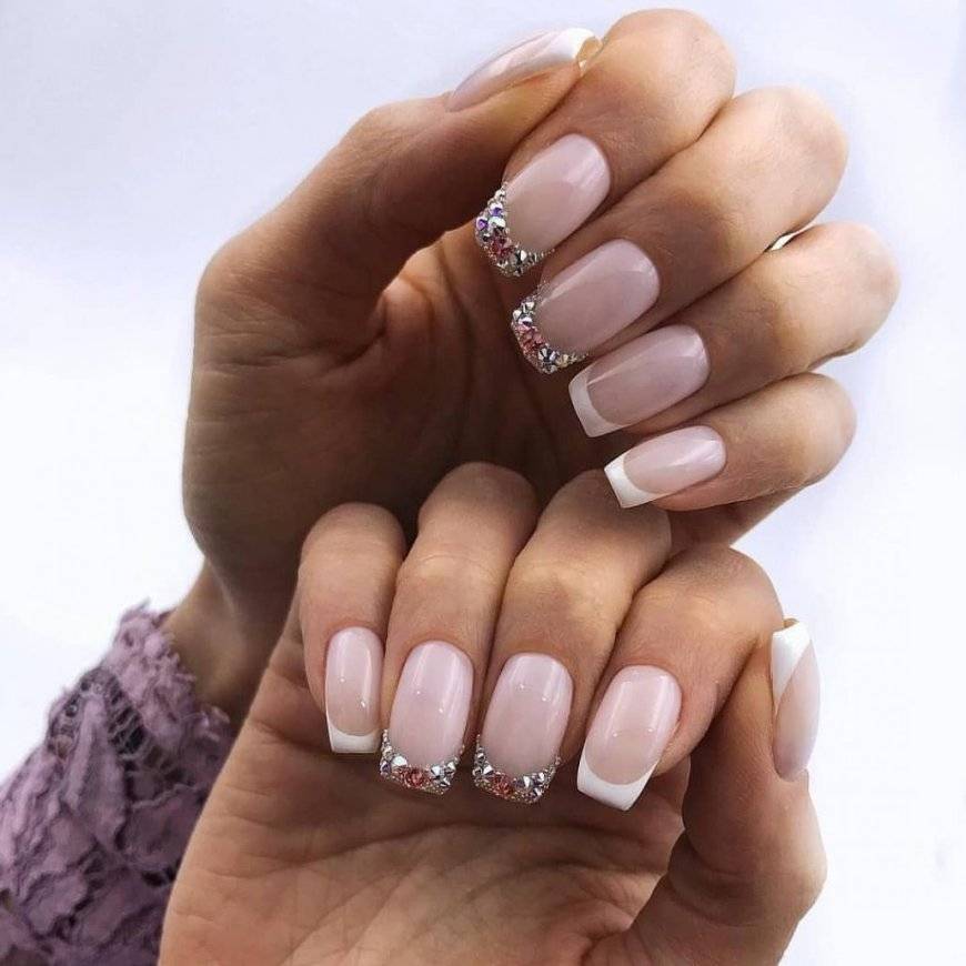 Мастера, которые знают, как сделать красивый французский маникюр, умеют передавать и блеск Эйфелевой башни. И лучше всего с этой идеей справляются стразы. Их можно размещать не только на отдельных пальцах. Но если вам хочется получить нежный и женственный образ, тогда рекомендуем отказаться от большого количества страз.