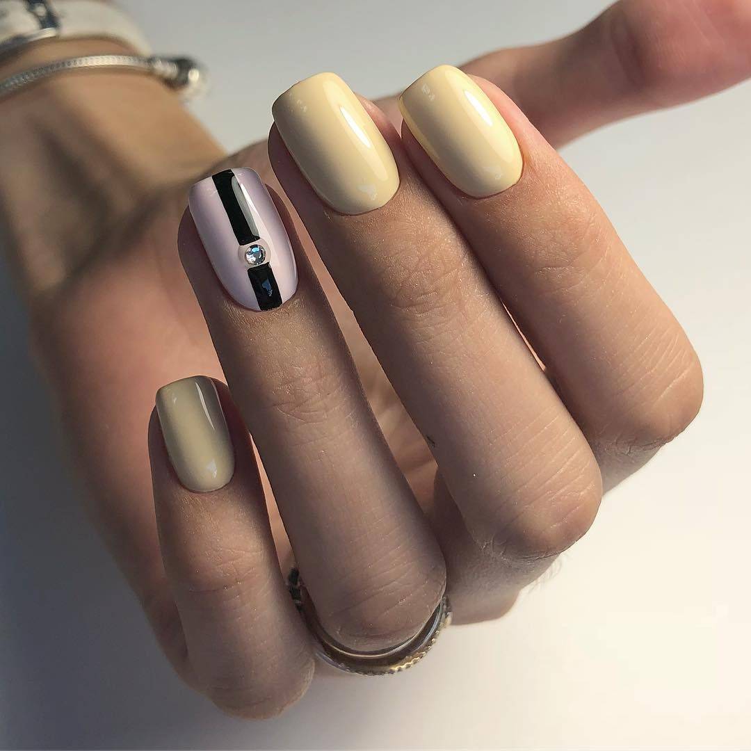 Ещё одно популярное сочетание, попавшее в тренд прямиком из классики. В новом сезоне актуально как традиционное «прочтение» этого сочетания, где ноготь покрывается черным лаком, а его кончик оформляется золотым, так и свежие решения. Например, зигзагообразная линия улыбки может быть оформлена наполовину черным лаком, наполовину – блестящим золотым глиттером. Завершает всё финишное глянцевое покрытие. Ещё один эффектный вариант – нанесение поверх черной линии улыбки золотой фольги с перекрытием ногтевой пластины слоем глянца. А вот от страз и замысловатого декора лучше отказаться.