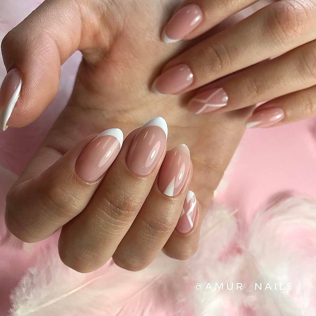 Вот пример красивого френча на миндалевидных ногтях с дизайном. Белые полумесяцы соединяются с яркими геометрическими формами.
