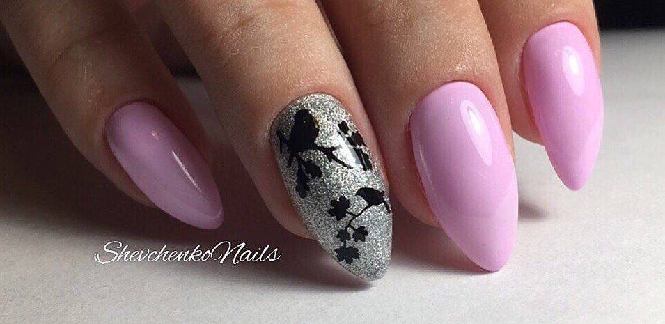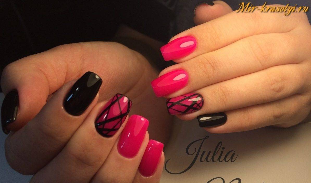 - Скромный розовый маникюр можно дополнить яркими черными узорами на некоторых ногтях