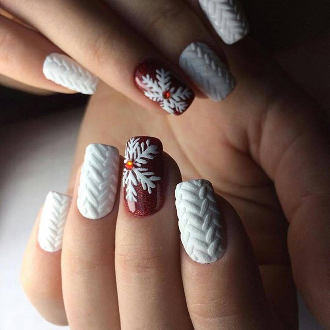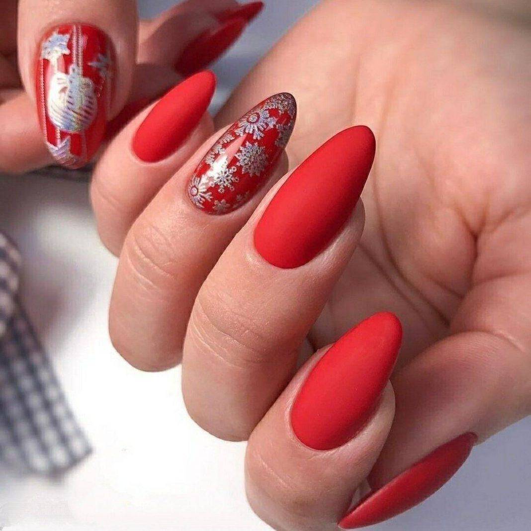 Зимой шикарно будет смотреться маникюр на фото ниже, сложный по выполнению и сочетающий в себе несколько техник. Основные пластинки покрыты глянцевым алым лаком, декор остальных различен.