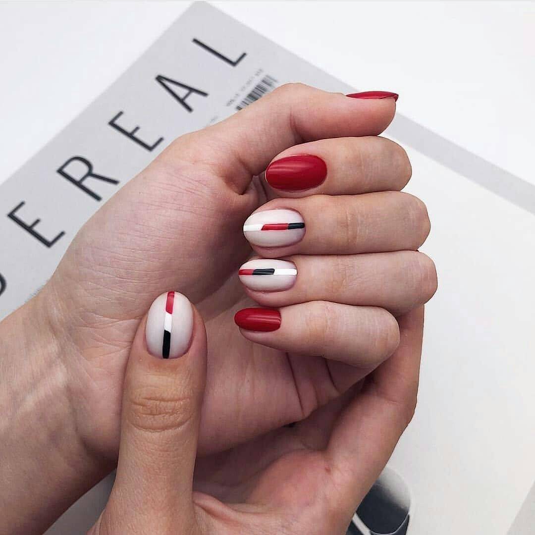 Если вы хотите внести в красный маникюр нотки повседневности, то без белого цвета не обойтись