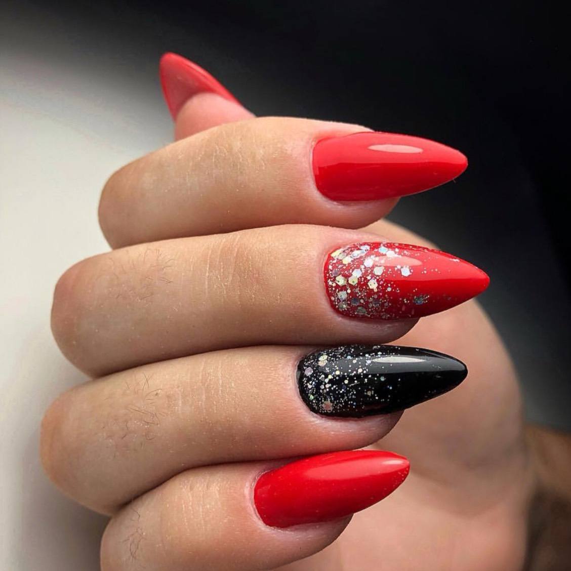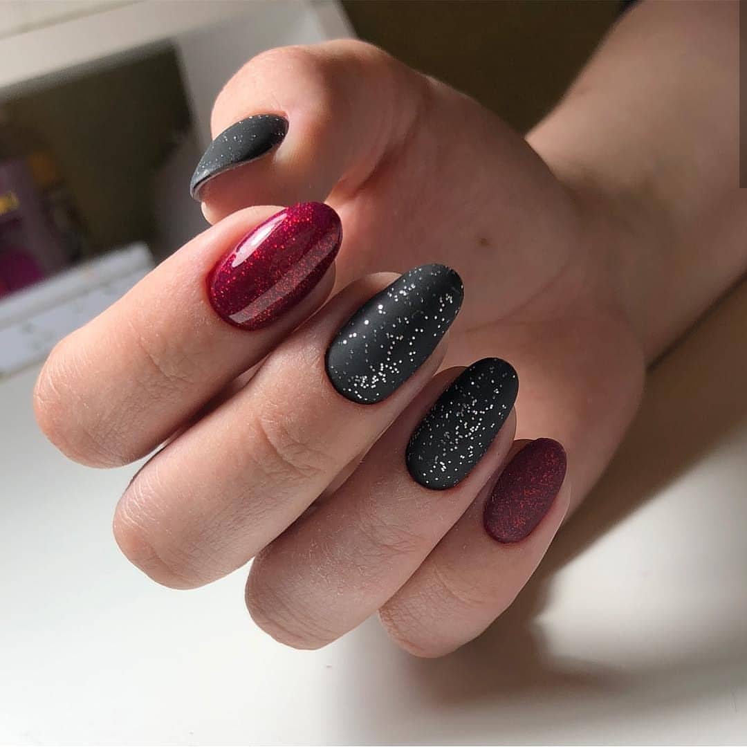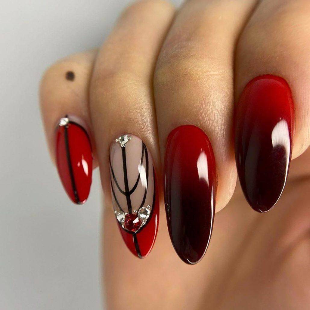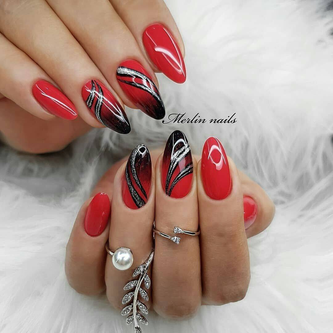 В красно-черном цвете шикарно выглядит градиентный маникюр. Выбирайте для дизайна гель-лаки с блестками, шиммером, глиттером и другими блестящими текстурами. Отлично смотрится соседство красного матового гель-лака и черного гель-лака с пайетками. Стоит учитывать, что оба цвета выглядят достаточно насыщенно и броско, поэтому не рекомендуется нагромождать ноготки геометрией, абстракцией, флористикой и другим декором. Оптимальный выбор – это однотонный маникюр с блестящим акцентом на 1-2 ноготках. Даже в торжественных образах такой маникюр будет смотреться уместно и сдержанно.
