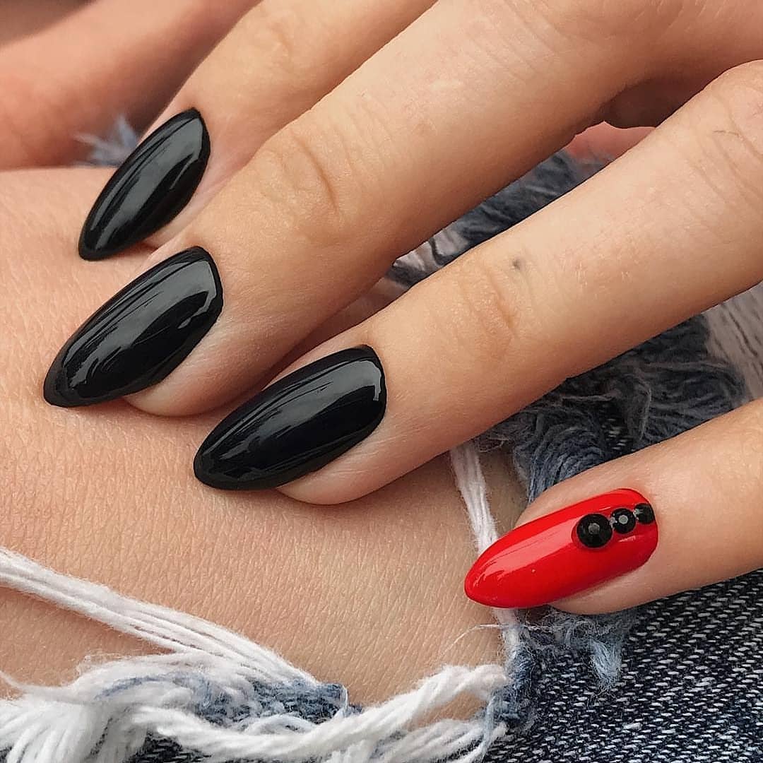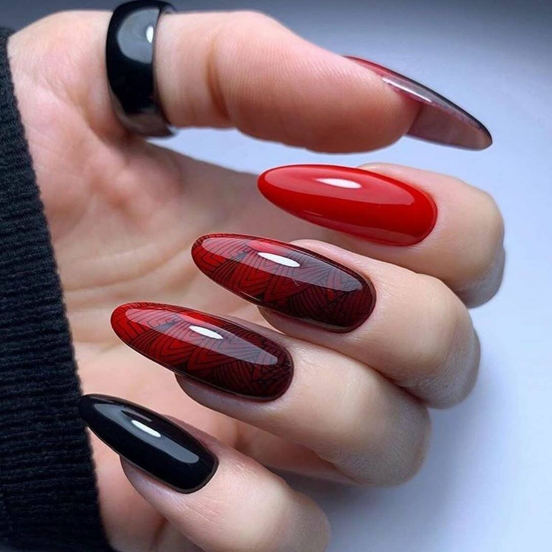 Женщины, жаждущие выделиться на фоне окружающих, часто совмещают красный и чёрный оттенок. Сочетание визуально увеличивает ноготь, делает его форму более вытянутой, изящной. Есть 2 способа комбинирования цветов: