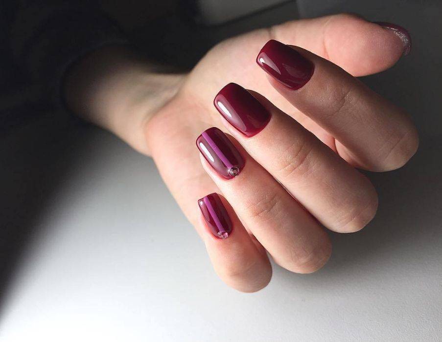 Вечный вопрос: “Что можно сделать на коротких ногтях?” Сейчас мастерами по маникюру придумана уже масса простых и лаконичных дизайнов, которые можно выполнить в бордовых оттенках даже на коротких ногтях. Насыщенный тон гармонично будет смотреться со светлой цветовой гаммой и неброскими рисунками. Отлично для коротких ногтей подойдет техника фен-шуй, где для декора выбираются только несколько ноготков.