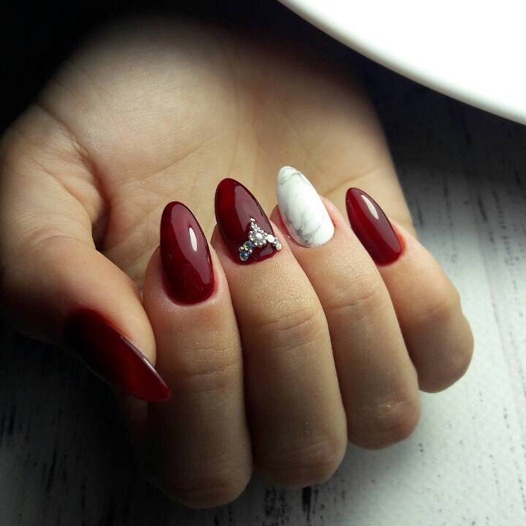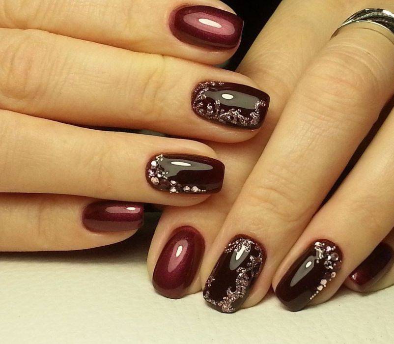 С насыщенными винными оттенками сочетается много вариантов гель-лаков. Начнем с классических базовых вариантов: с белым и черным лаком, а также с золотом в виде пудры, блесток, фольги или втирки. Если у Вас в гардеробе есть бордовое платье, но к нему не хочется делать темный маникюр, то разбавьте маникюр розовым, бежевым оттенком или другим модным цветом маникюра. Для любителей более экстравагантных сочетаний подборка фото самых ярких и необычных вариантов оформления ногтей.