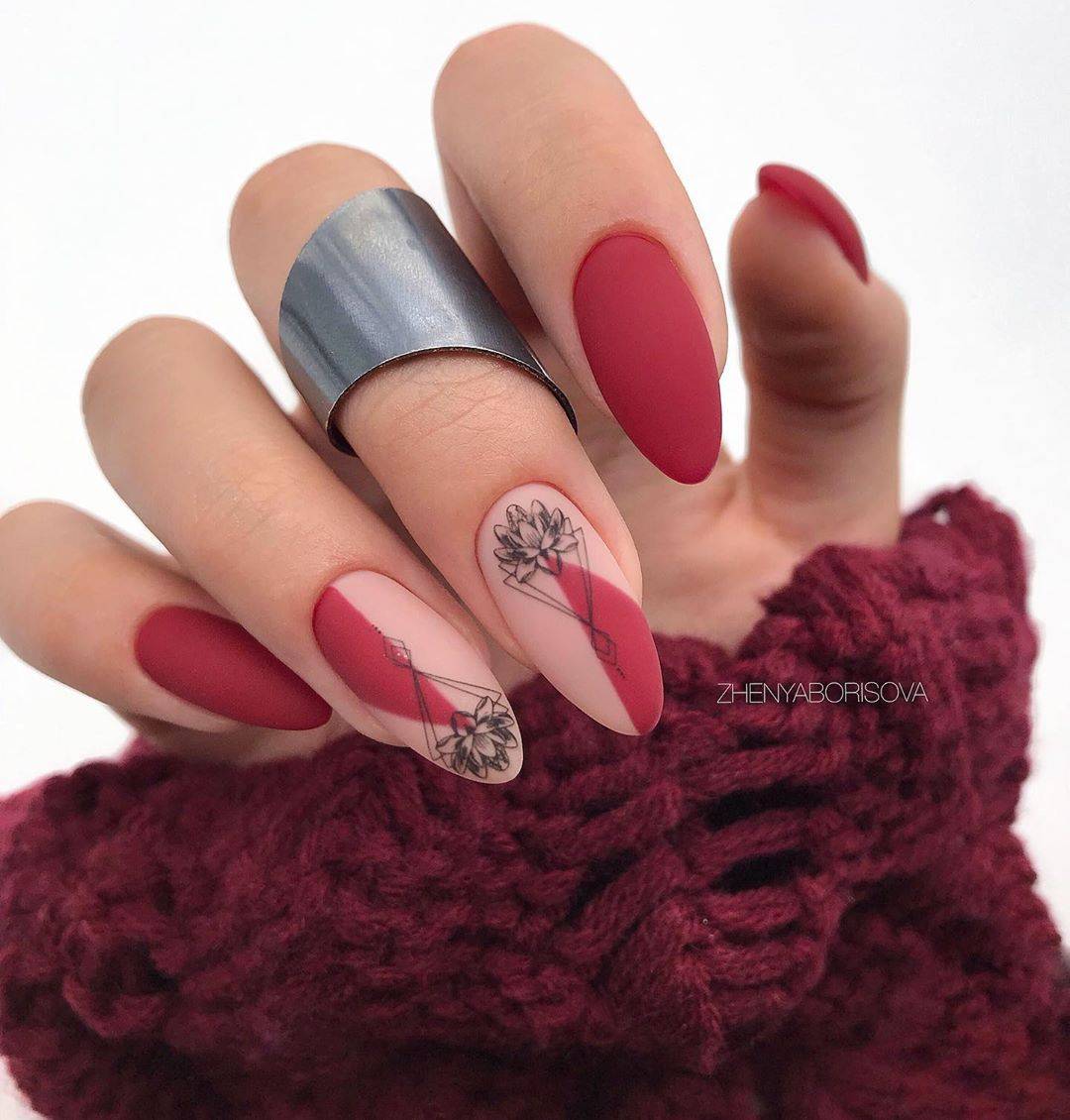 Если у вас неброский макияж и прическа в виде прямого короткого каре, то лучше выбрать минимализм. А вот любительницам цветочных принтов и романтических оттенков в гардеробе лучше отдать предпочтение маникюру с вензелями и природными мотивами. Несколько интересных идей с бордовым маникюром в разных стилях смотрите на фото.