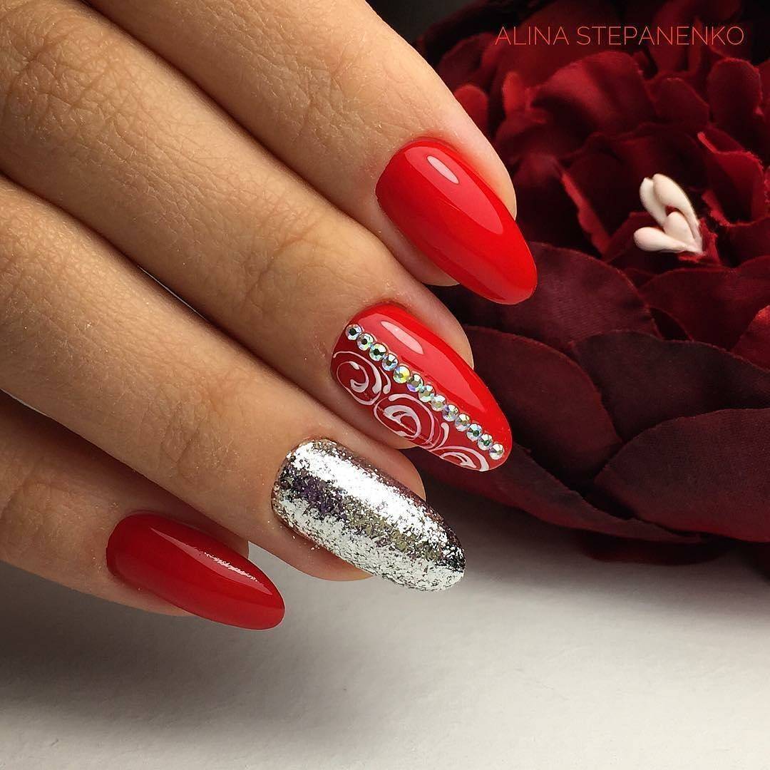 Красный маникюр с золотом и серебром