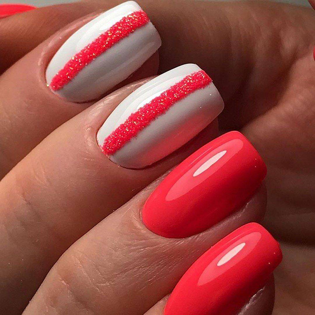 Если вы хотите яркий, но не слишком вызывающий маникюр, то остановите свой выбор на однотонном нейл-арте в красном и белом цвете.