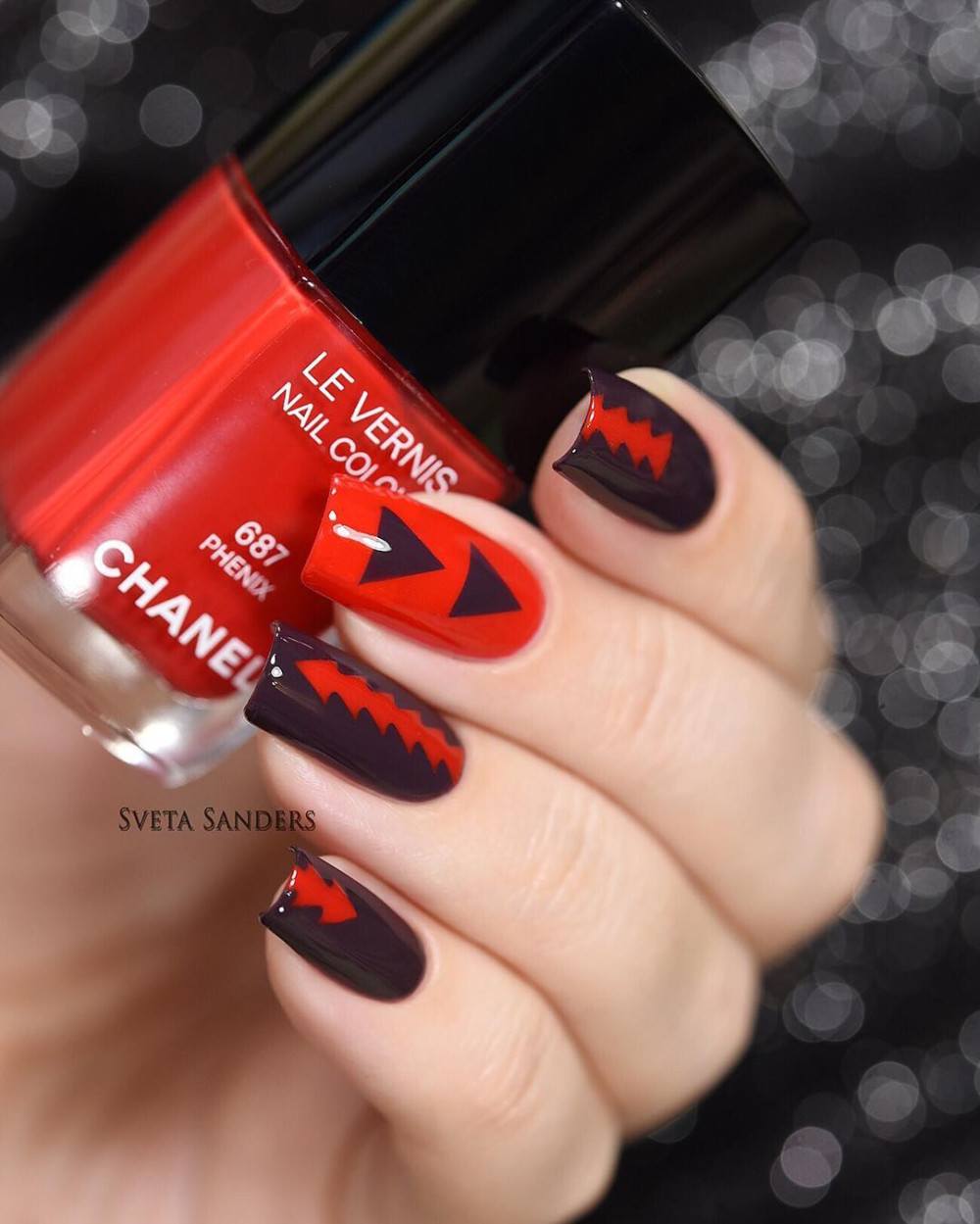 - возьмите красный лак и проведите V-образную линию выше черной;