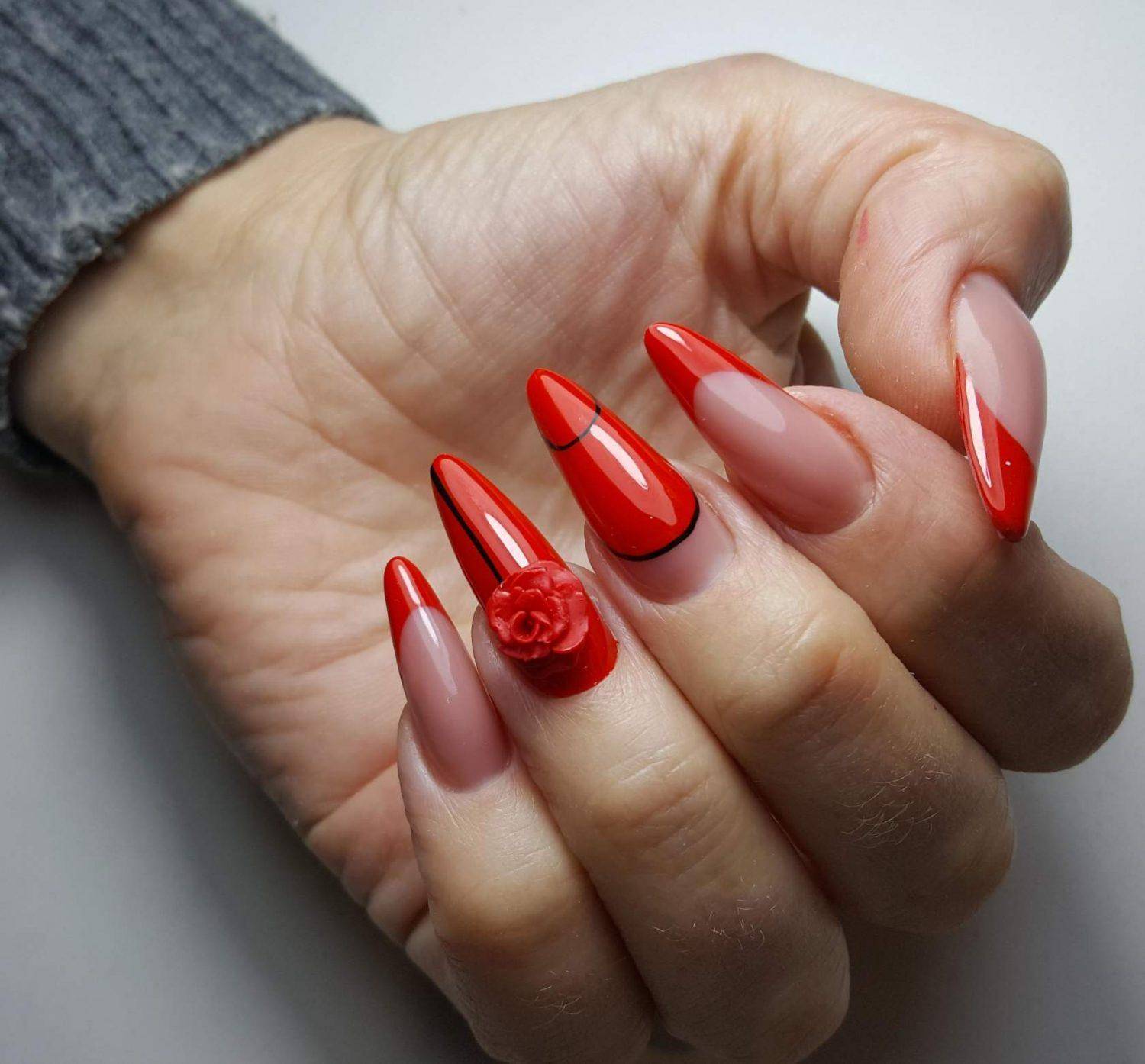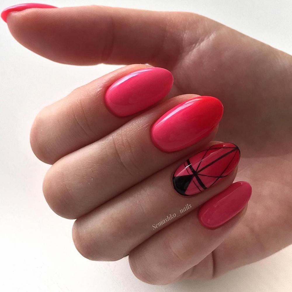 Вариант сложный, подойдет не каждой даме, поскольку цвета плохо гармонируют между собой. Для создания красивого дизайна применяют связывающие элементы в виде дополнительных оттенков: нежно-зелёного, чёрного, белого, серого. В качестве украшения красно-розового покрытия акцентируют безымянный палец объёмным рисунком.