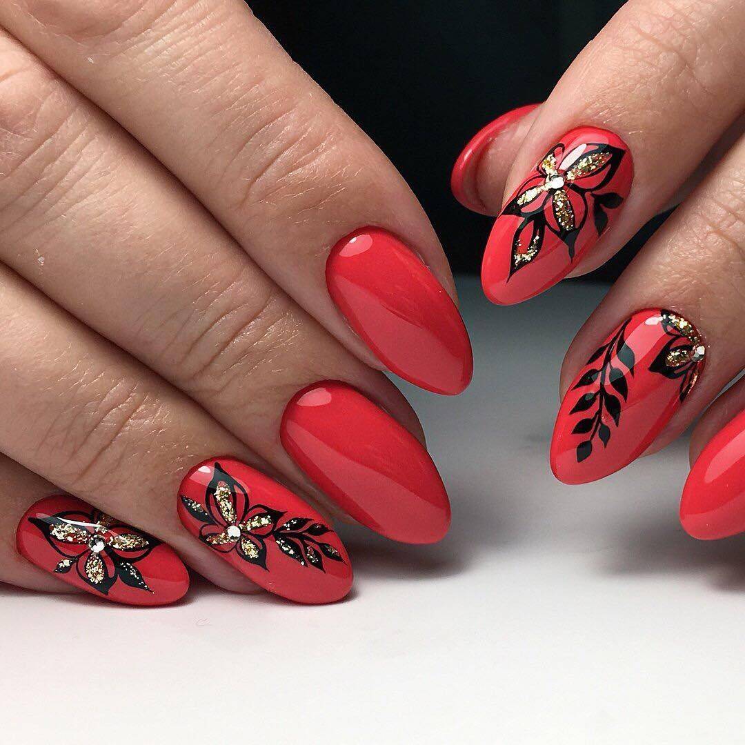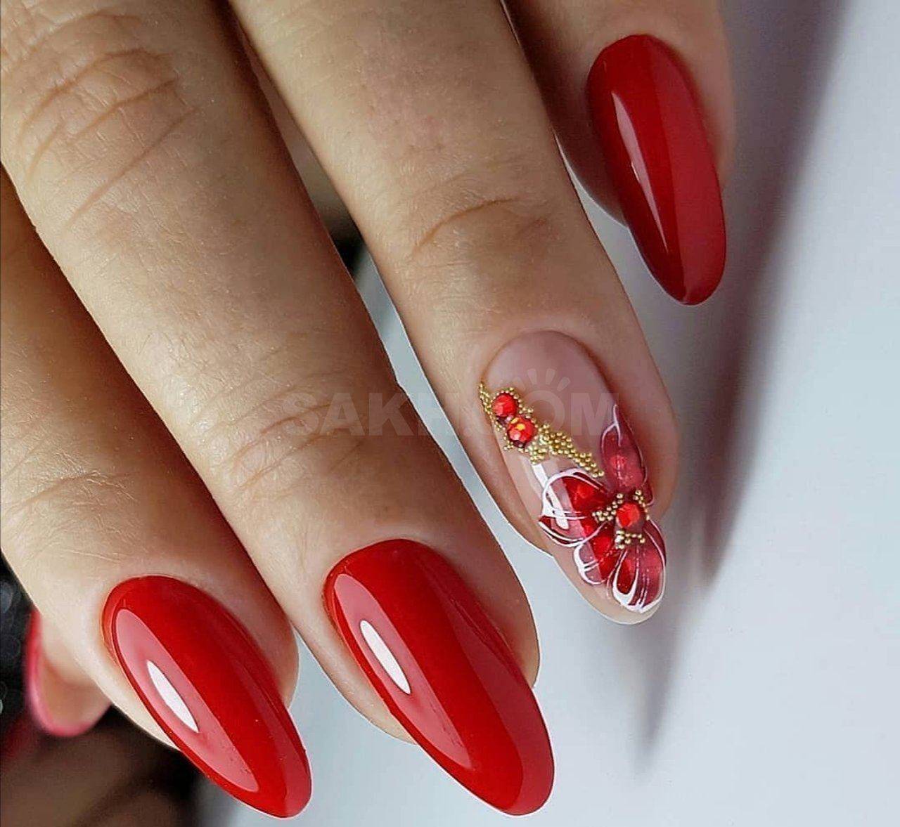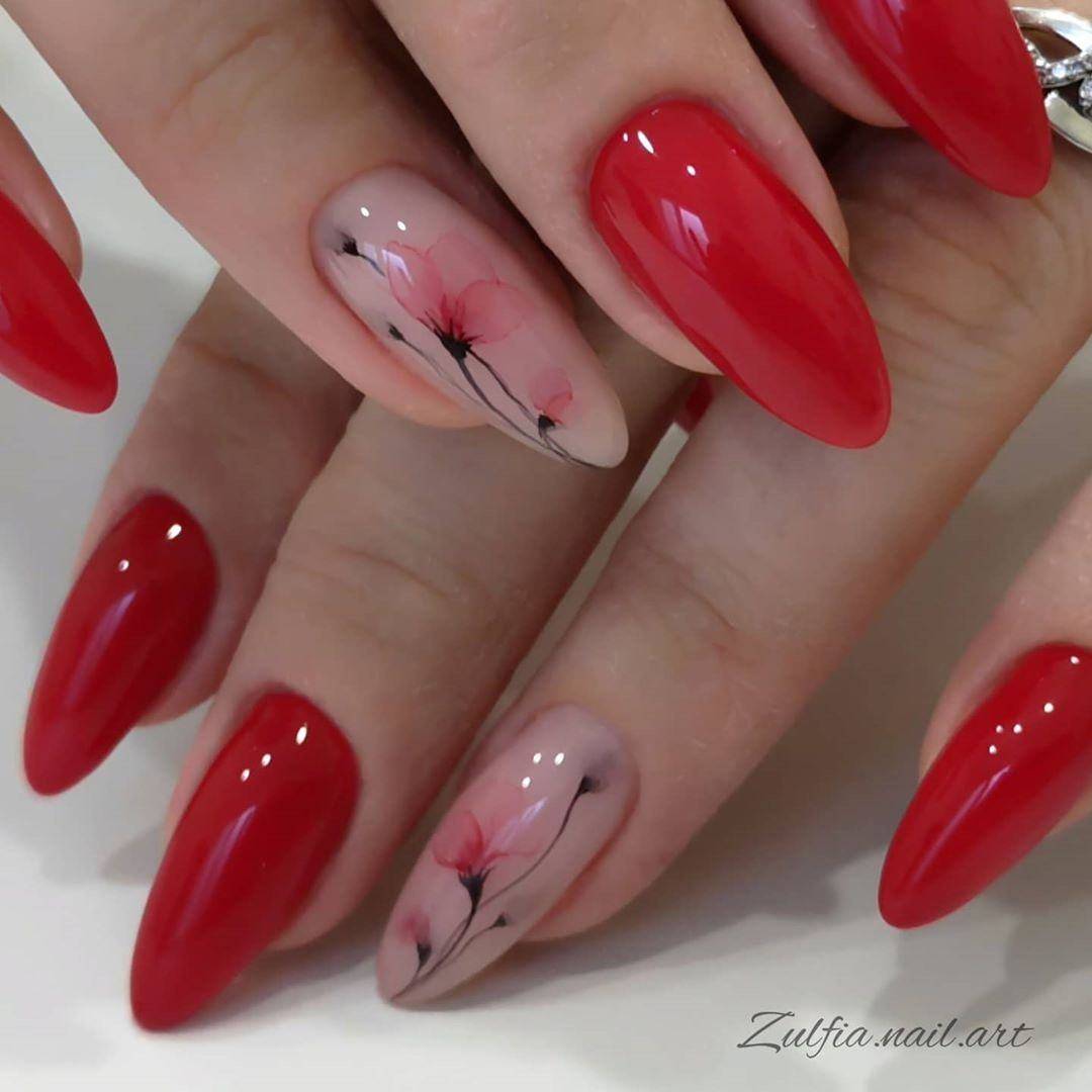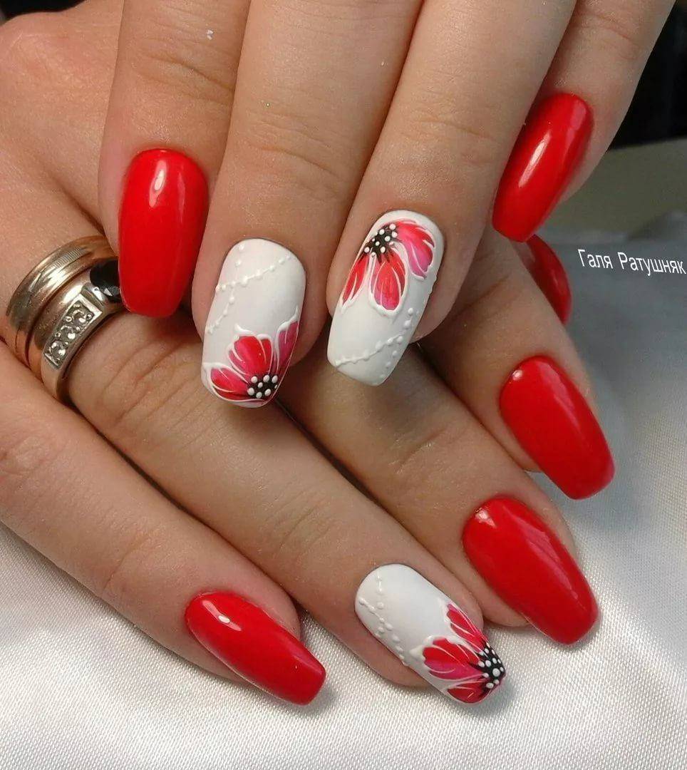 Прелестный маникюр в красном цвете 2021-2022 с флористическими узорами