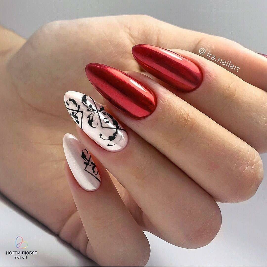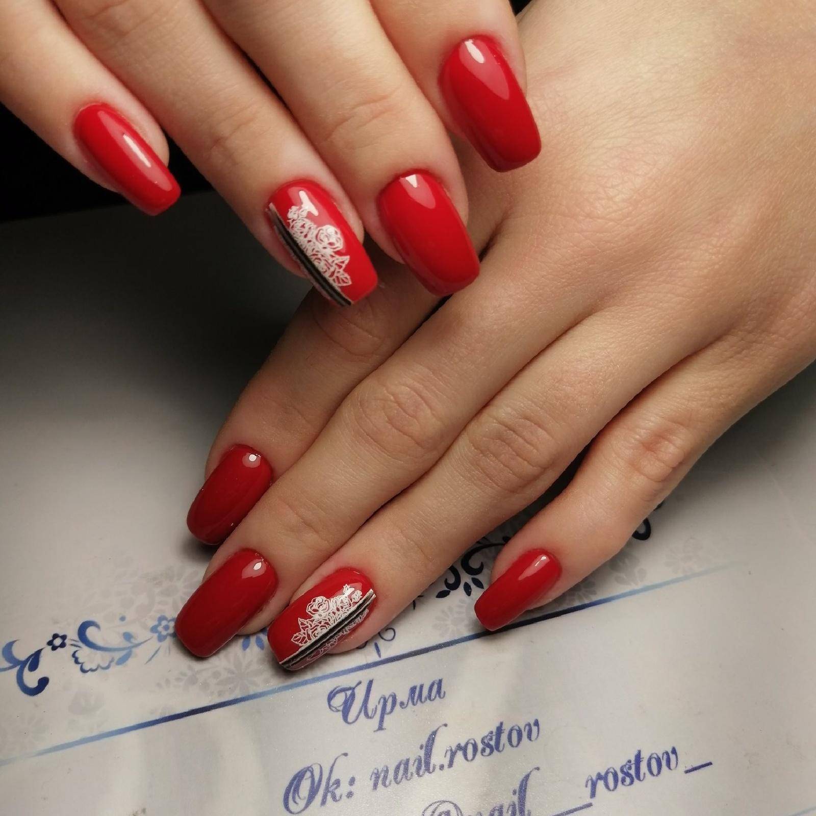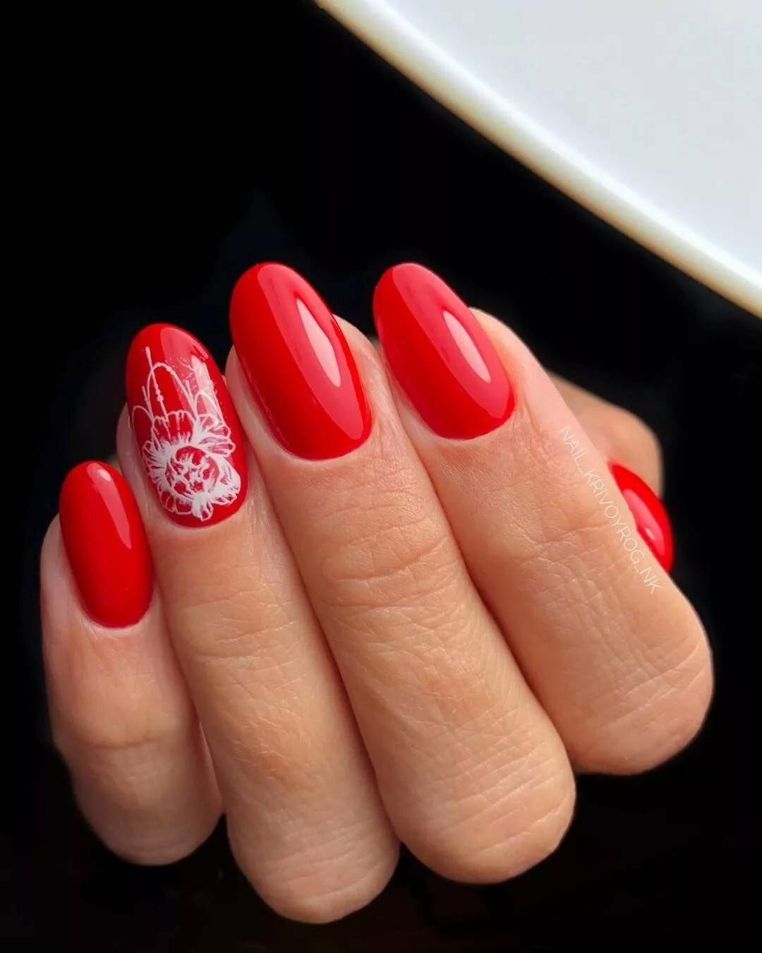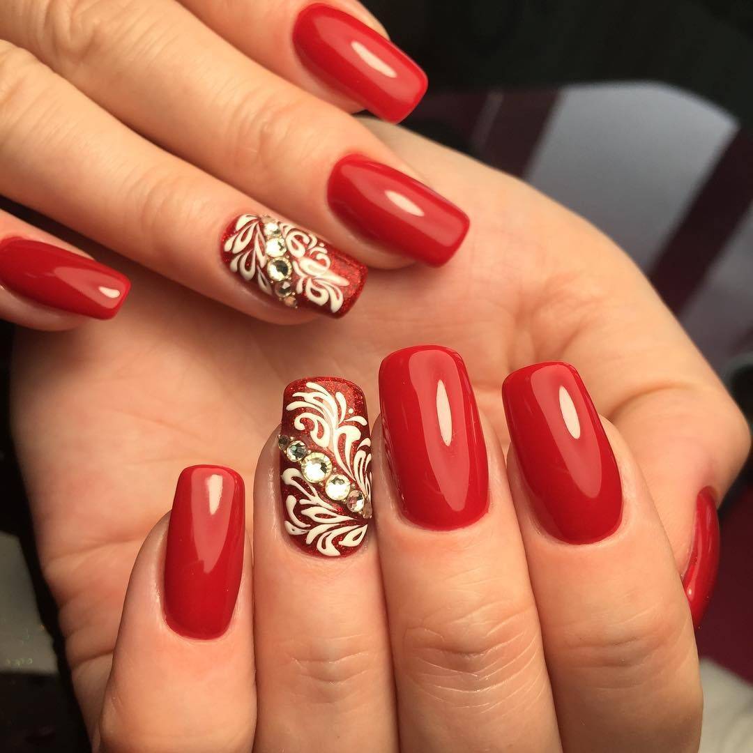 Белым можно сделать лишь несколько неброских акцентов, а иногда и выбрать его как фон для красивого рисунка. Нежным и утончённым маникюр сделают белоснежные вензеля на алом фоне.
