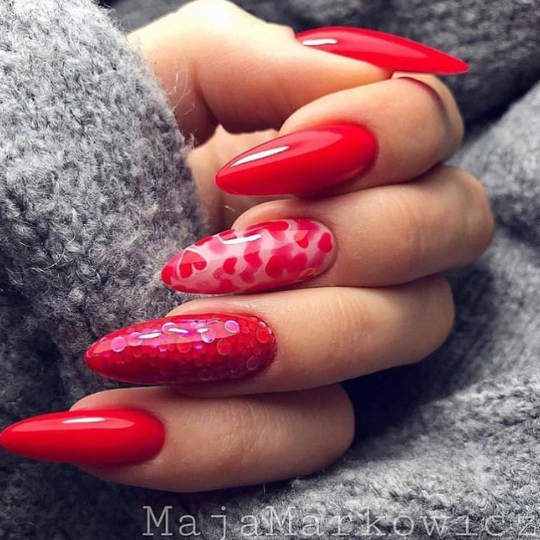 На фото коллекций модных брендов представлены интересные сочетания эффектов в дизайне ногтей. Можно выбрать разные техники покрытия и сделать самый красивый дизайн с алым лаком.
