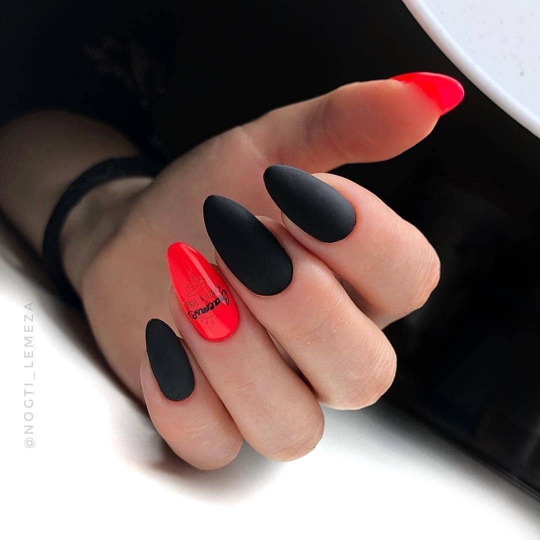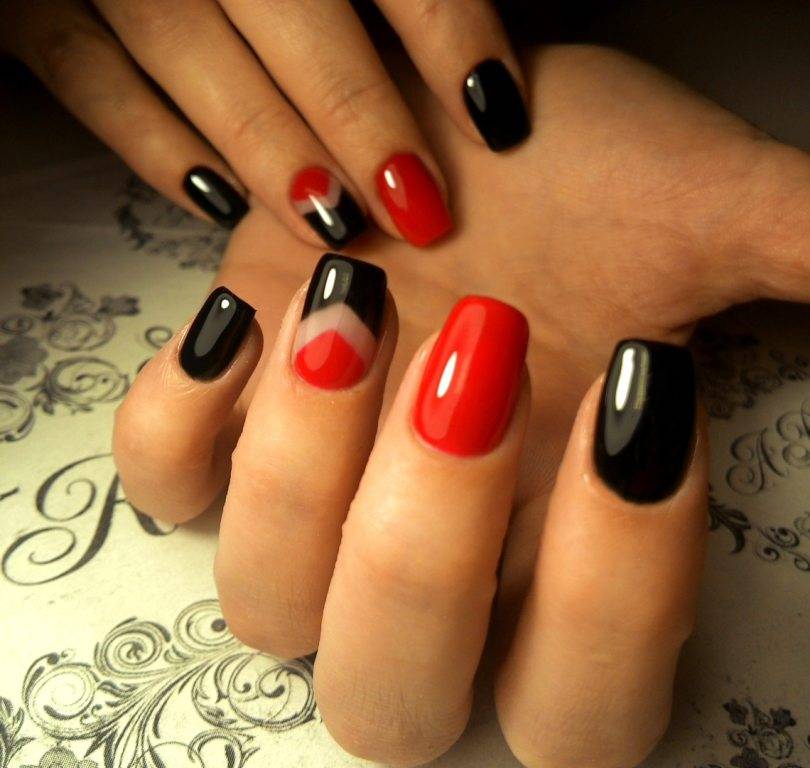 Сочетание красного и черного выглядит невероятно насыщенно и броско. Такой дизайн точно не останется незамеченным. Тандем черного и красного может быть использован для повседневный образов, но при условии, что выполнен однотонный маникюр. Черный и красный часто используется в торжественных образах. При этом желательно, чтобы дизайн ногтей гармонировал с украшениями или сумочкой.