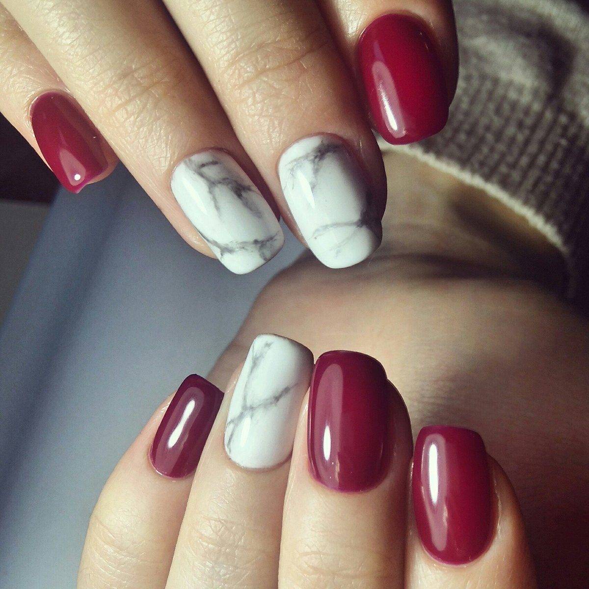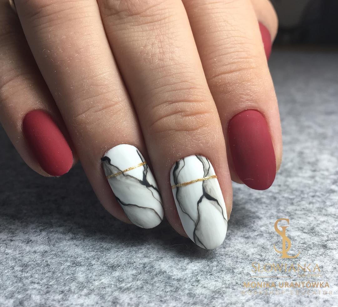 Вместо серого цвета можно использовать также красный оттенок, который будет имитировать натуральный камень. Такой дизайн выглядит гораздо заметнее, так как в нем визуально много красного цвета. Интересно смотрится маникюр с красным фоном и черными прожилками мрамора. На фото ниже и в фото-галерее в конце обзора вы найдете множество примеров этого стильного дизайна ногтей.