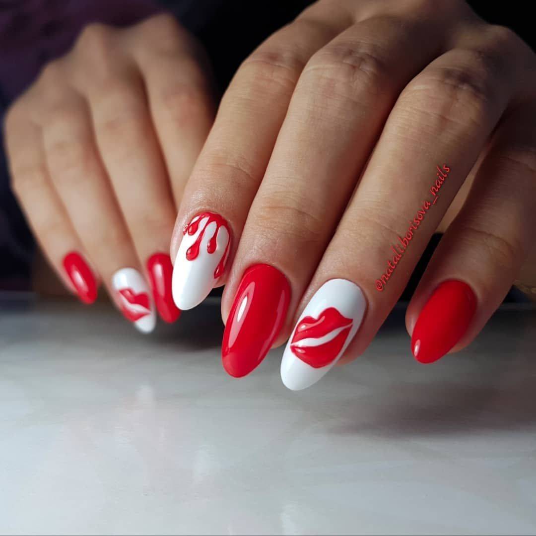 Красно-белый маникюр привлекает еще большее внимание, чем однотонные красные нейл-арты, поэтому импровизация при это создании не уместна. Вы должны заранее определить какой дизайн хотите видеть на своих ноготках