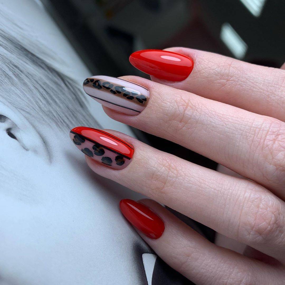 Не выходят из моды и анималистические тенденции: леопардовый принт отлично гармонирует с красным цветом. В качестве декора выступают блестящее покрытие на отдельных ноготках, а также стразы.
