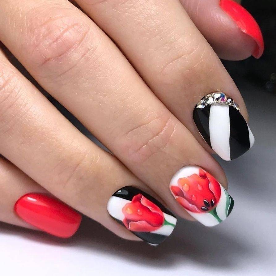 Красно-черный маникюр с дизайном: цветы, геометрия, стразы