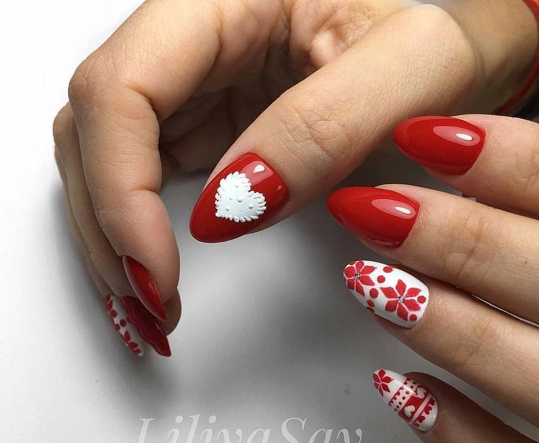 Сочетание красного и белого цвета подходит как для праздника, так и для повседневной жизни. Чтобы усовершенствовать дизайн, стоит применить технику объёмного рисунка. Украсить 1 или 2 пальца стразами, камнями.