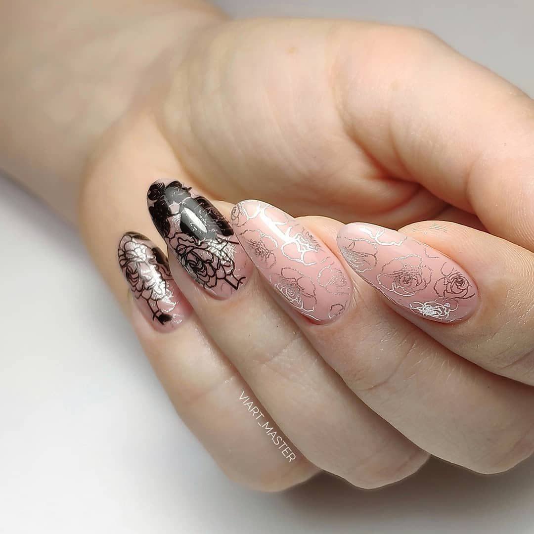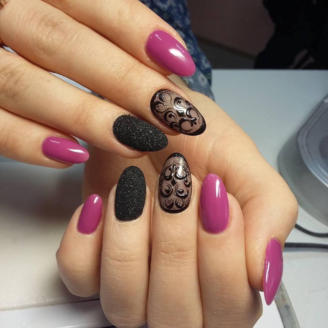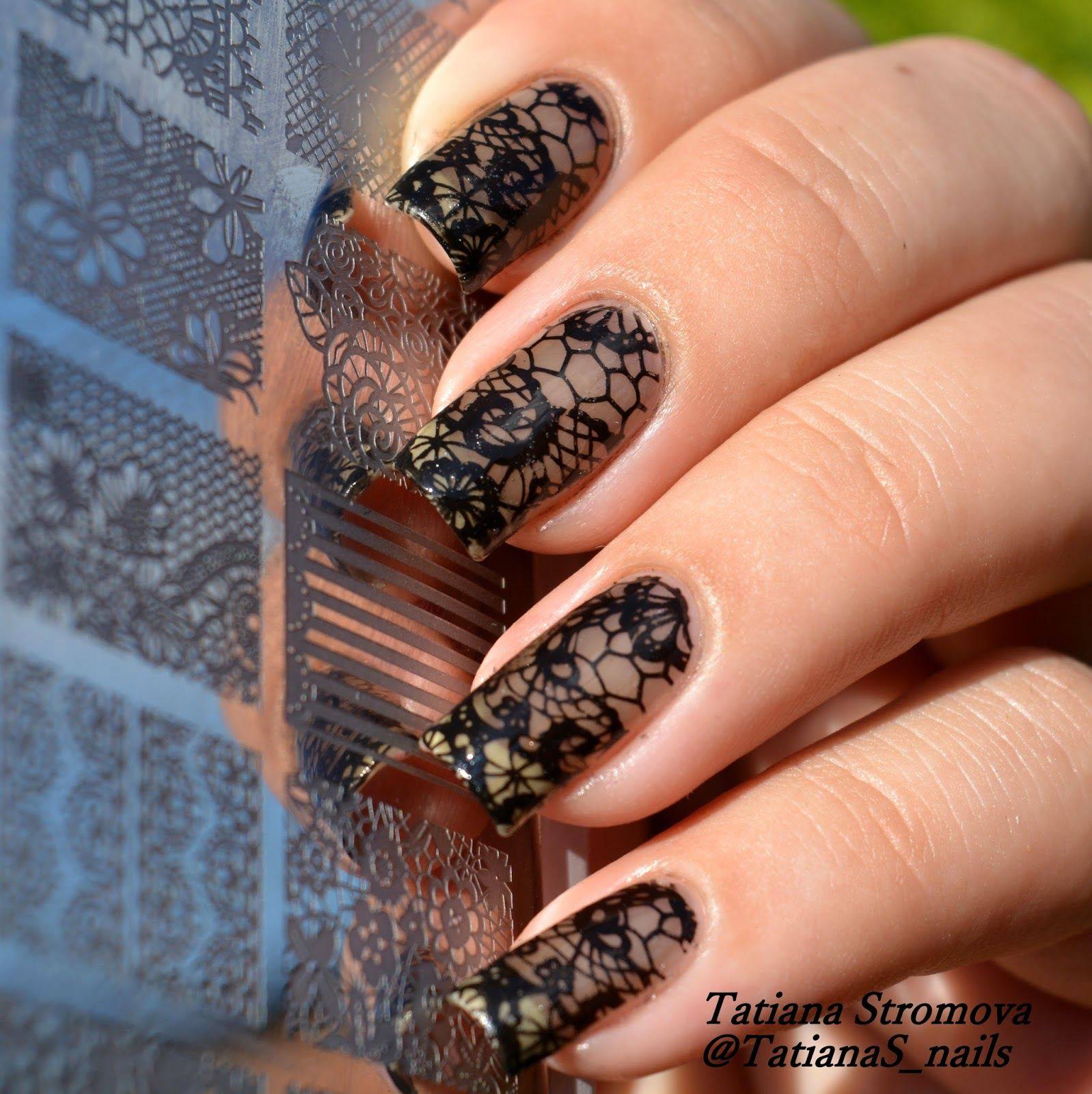 Красиво смотрится маникюр, где кружевной декор продублирован черной акриловой пудрой. Маникюр приобретает бархатность и изысканность, смотрится очень нежно и женственно. В создании вечернего маникюра с кружевом выручит стемпинг. С его помощью можно создать удивительно красивые нейл-арты за считанные минуты.