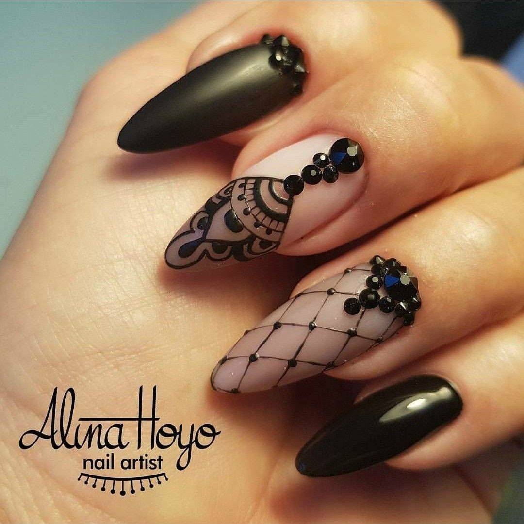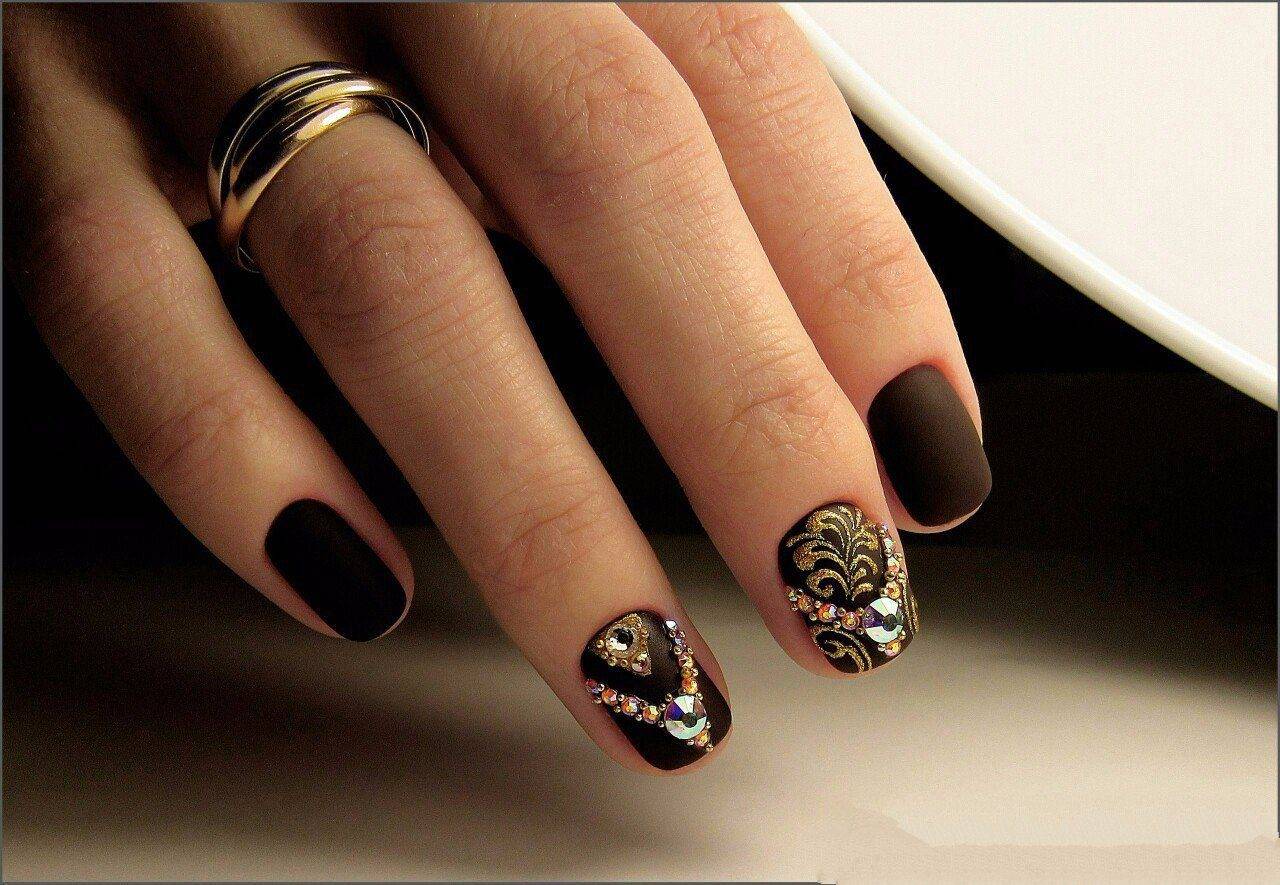 Черный маникюр уместнее всего смотрится в вечернем образе. Он гармонирует с образом девушки, дарит ему нотки таинственности и шарма. Маникюр в черном цвете желательно дополнять декором стразами, бульонками, матовыми текстурами, техникой вуаль. Не рекомендуется выполнять однотонный матовый маникюр без какого-либо декора.