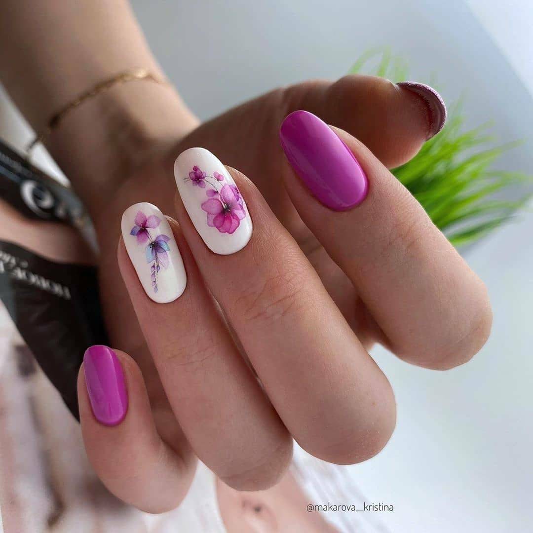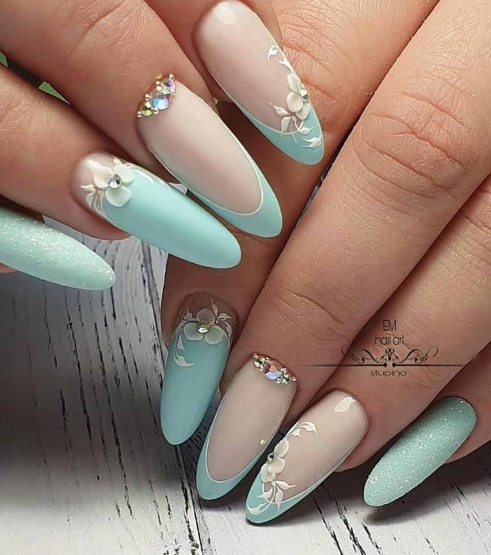 В качестве основного цвета маникюра стоит выбирать светлый оттенок. К примеру, бежевый – идеальный вариант практически для любого дизайна. Не менее привлекательно смотрится цветочный рисунок с французским или лунным маникюром. К тому же, можно дополнить его декором в виде сухоцветов, небольших бусин или страз.