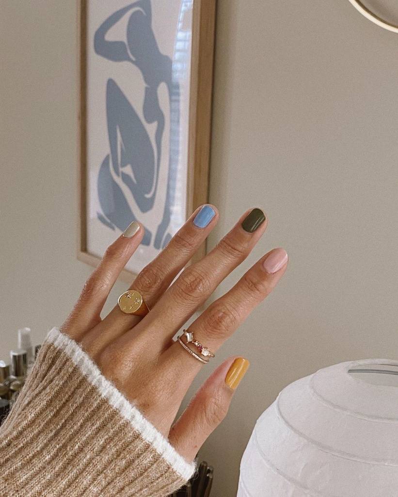Уникальный и модный стиль ногтей, который сейчас вызывает много шума — это вариации тона, градиентный или разноцветный маникюр, как его еще называют. Этот дизайн ногтей включает выбор одного основного цвета, начиная с большого пальца. Оттенок начинается с самого темного и постепенно становится светлее по мере того, как окрашивается каждый ноготь. В качестве альтернативы вы можете выбрать разные пастельные оттенки для каждого ногтя, которые актуальны в 2021 году.