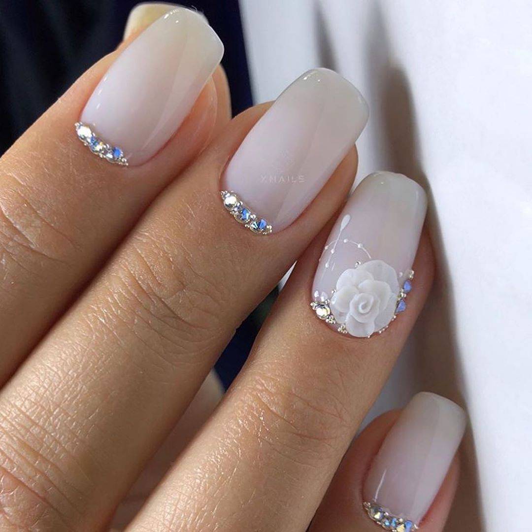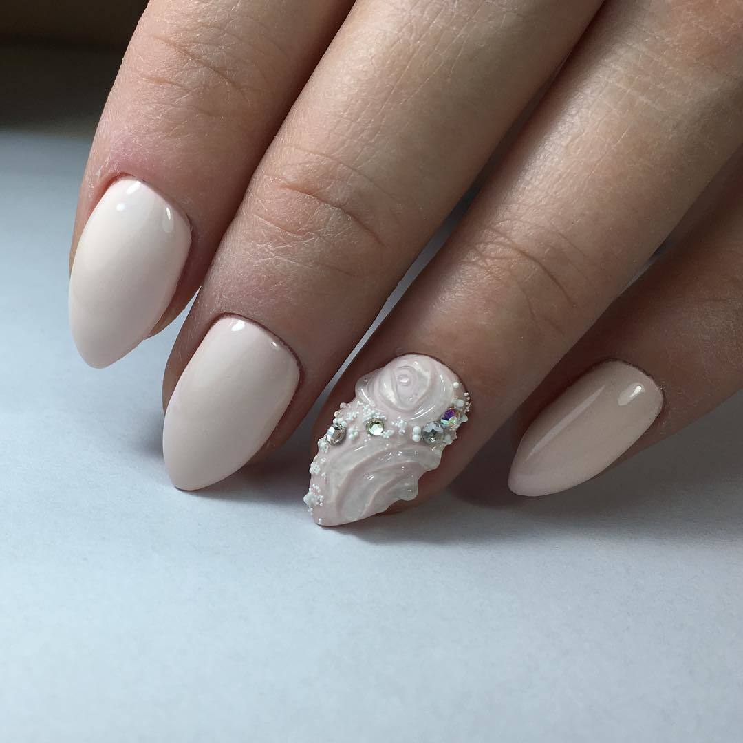 Достаточно всего лишь нескольких жемчужных бусин, чтобы универсальное покрытие молочного оттенка, которое используют в nude-маникюре, стало выглядеть более изящным и оригинальным — за счет 3D-эффекта, который создает этот красивый декор на очень коротких ногтях.