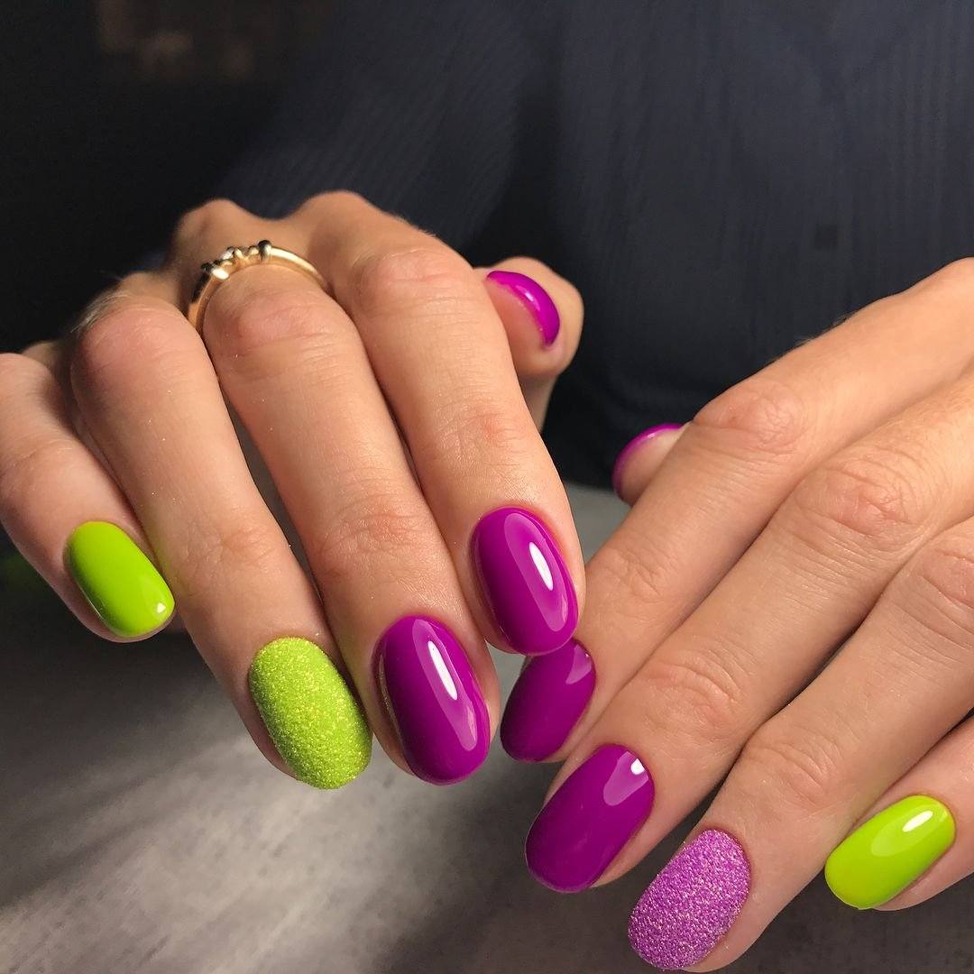 Нейл-мастера советуют нам не бояться соединять на коротких ногтях кричащие неоновые оттенки со спокойным и умиротворяющим нюдом. Они отлично ладят — увидите сами, если сделаете френч с кислотными кончиками и кремово-бежевой основой.