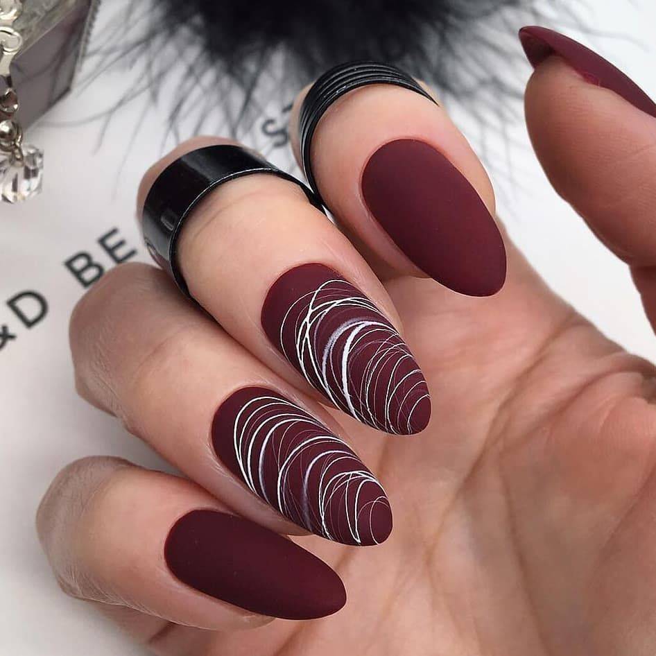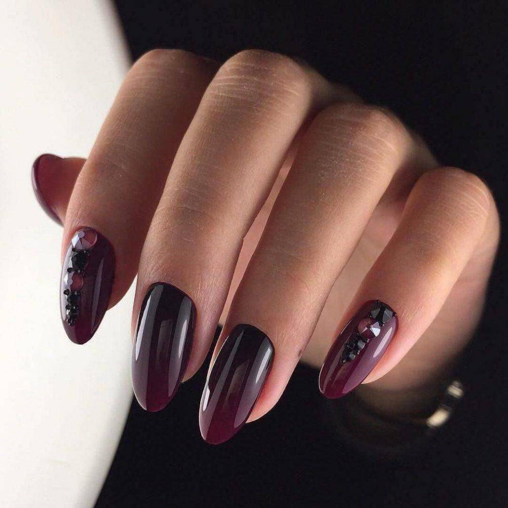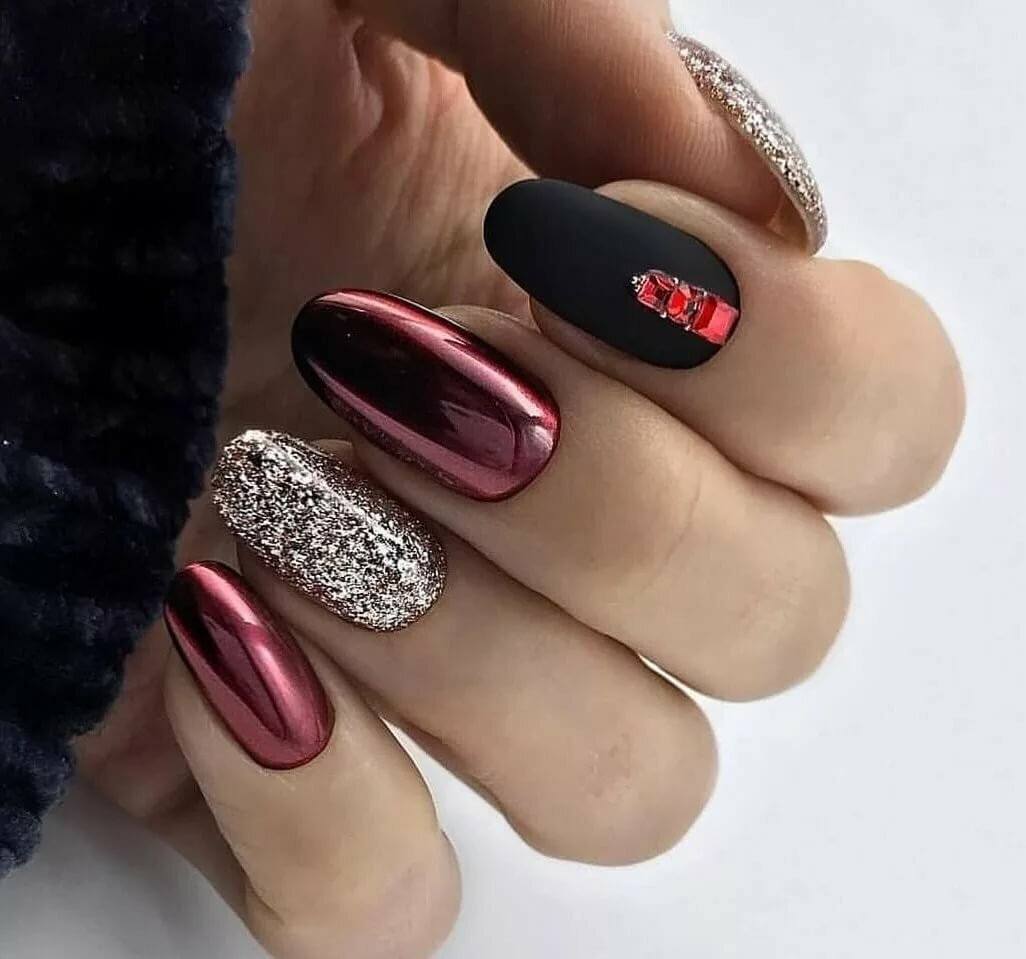 Для примера можно использовать лак винного оттенка. С ним прекрасно сочетается серебристый, белый, золотой и черный цвет.