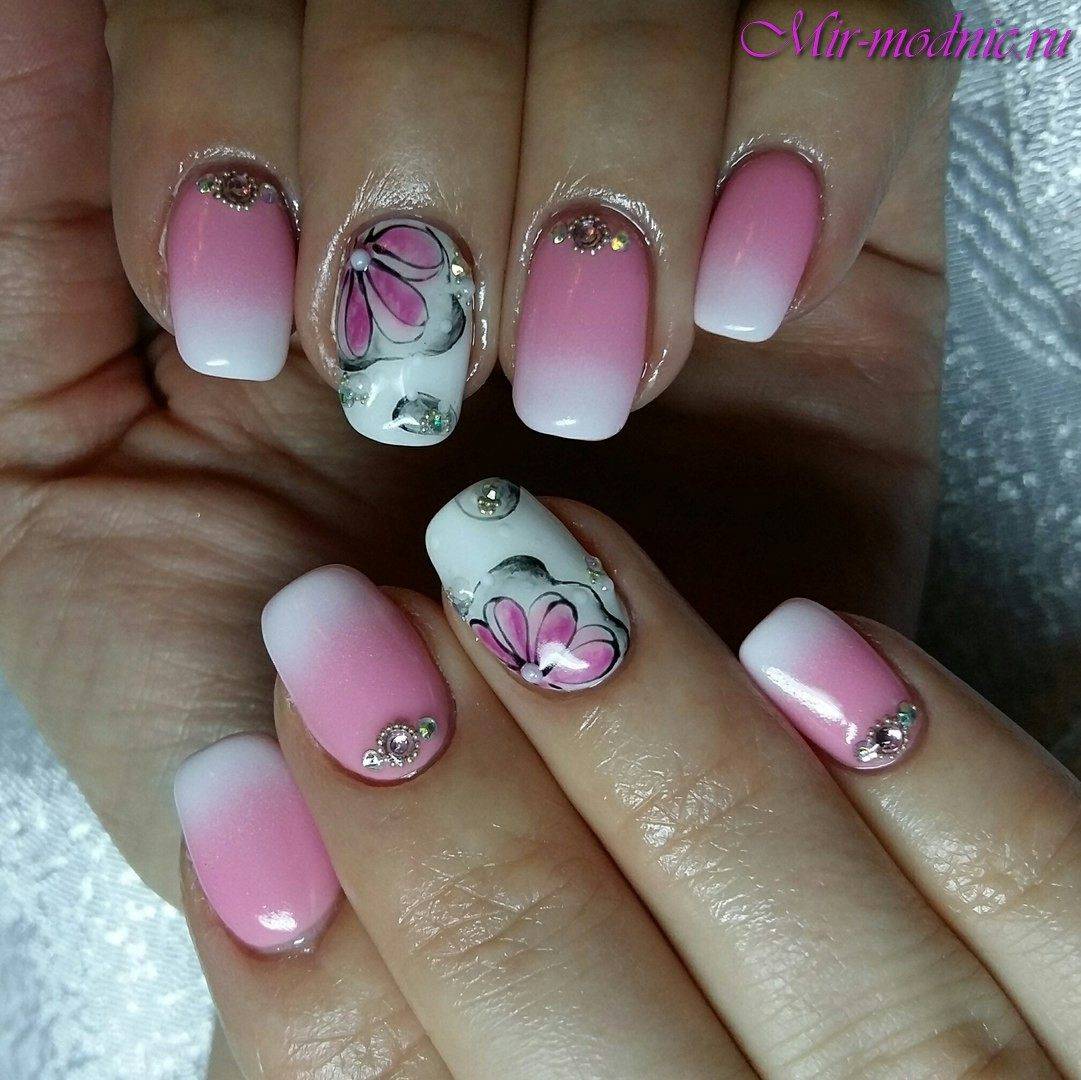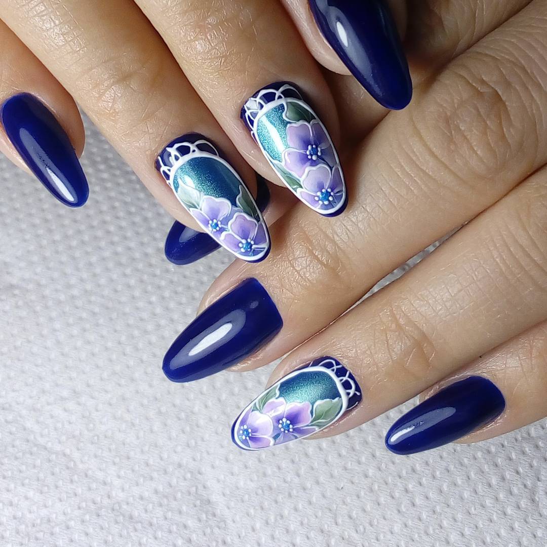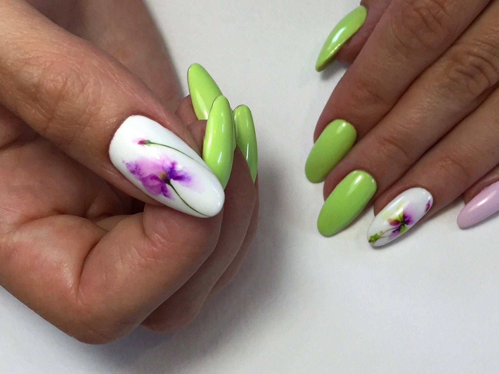 Дизайн акварельными красками сочетается с техникой омбре. На одном лепестке цветка может присутствовать плавный переход оттенков в пределах одного цвета. Акварельный дизайн – это мягкие спокойные оттенки, такие же как сам декор. Конечный результат работы акварельными красками – шедевр нейл-дизайна. Такой декор сложно сравнить с каким-либо другим подобным дизайном. Особенность дизайна акварельными красками в том, что весь узор выполняется вручную, а не слайдерами или трафаретами.