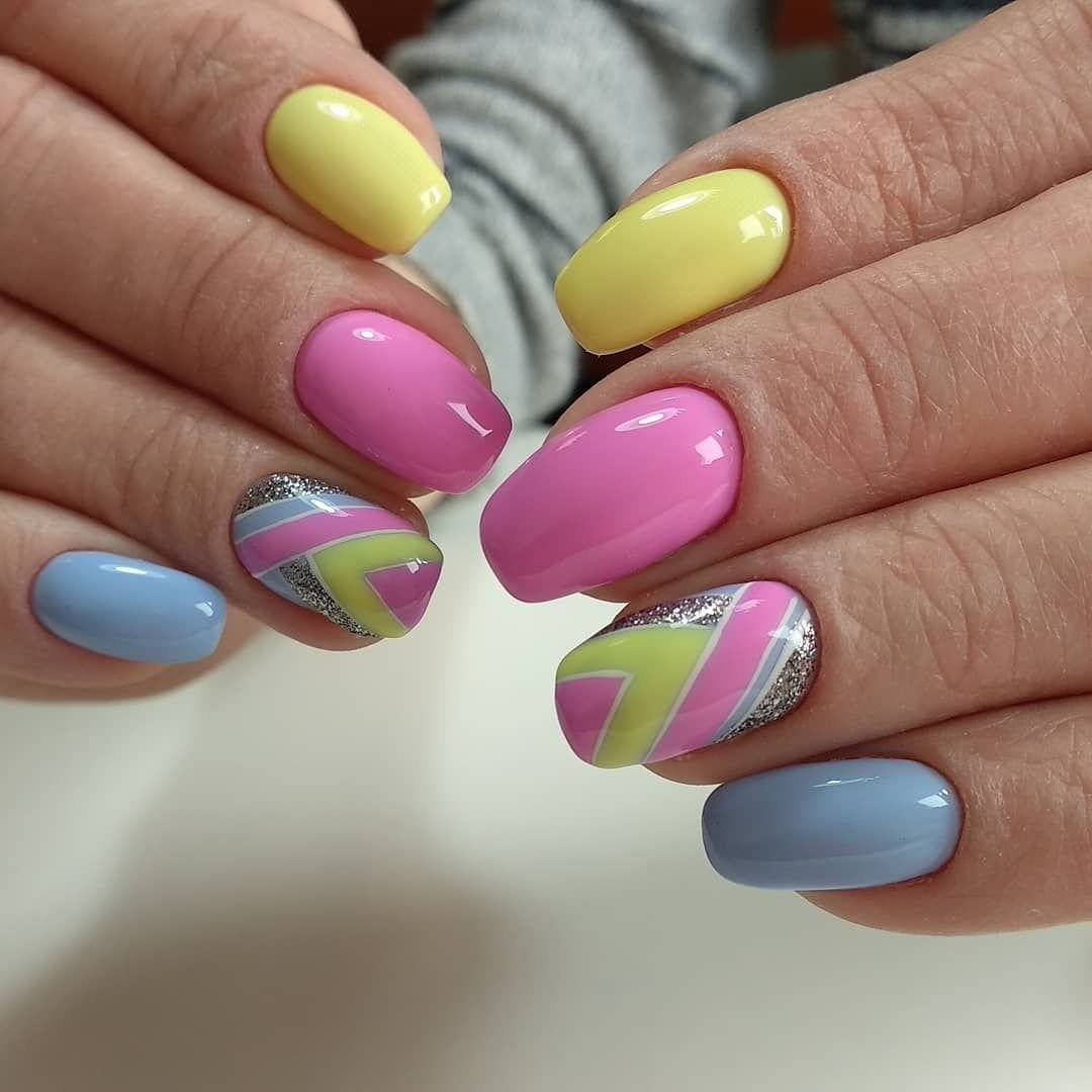 Пирамида. Для такого решения понадобится несколько цветов лака и бумажный скотч. На подсохший слой базового оттенка при помощи липкой ленты наносятся разноцветные сегменты будущей пирамиды.